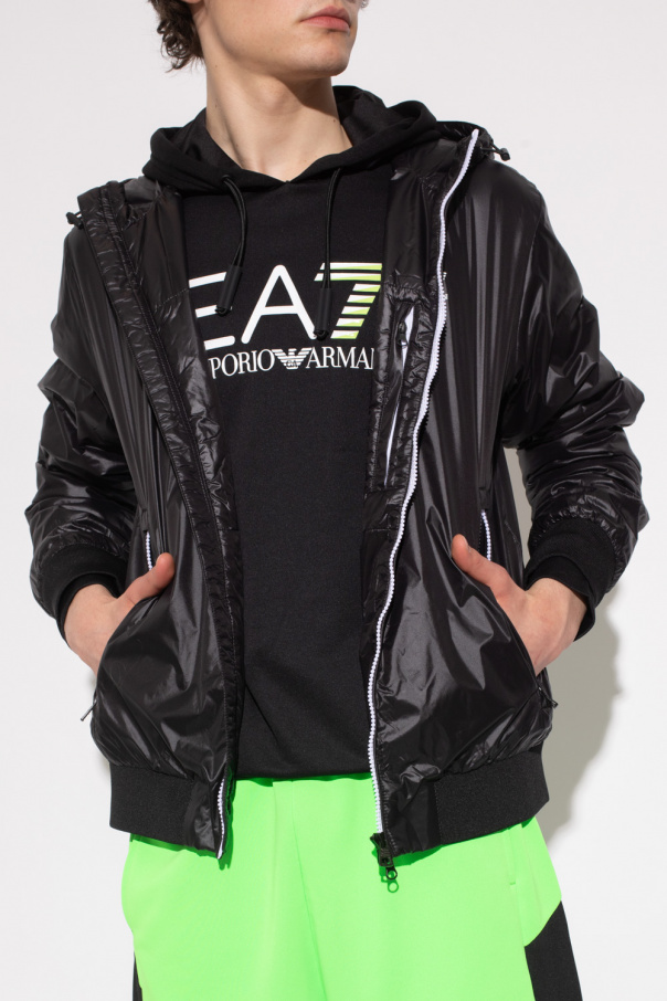 Black jacket from EA7 Emporio Armani. Printed with the brand's logo in white, this style features a two-way zip fastening, a drawcord-adjustable hood, two zip pockets and elasticized trims on the edges.
