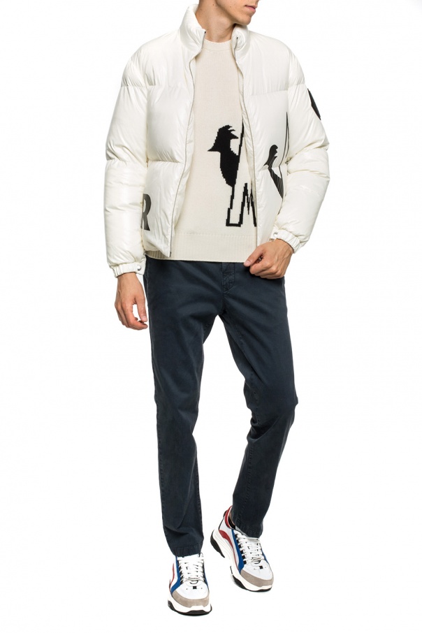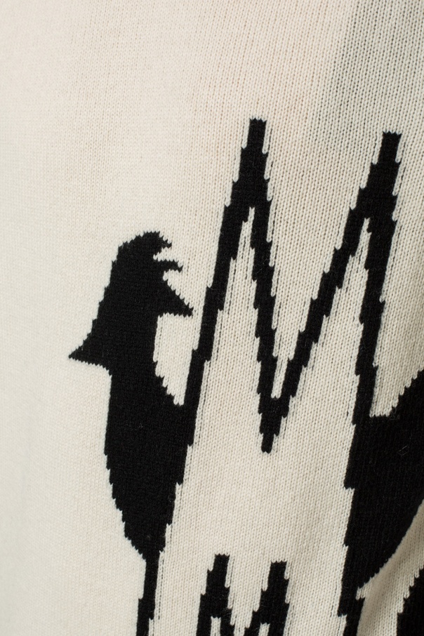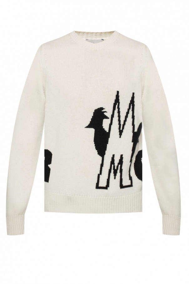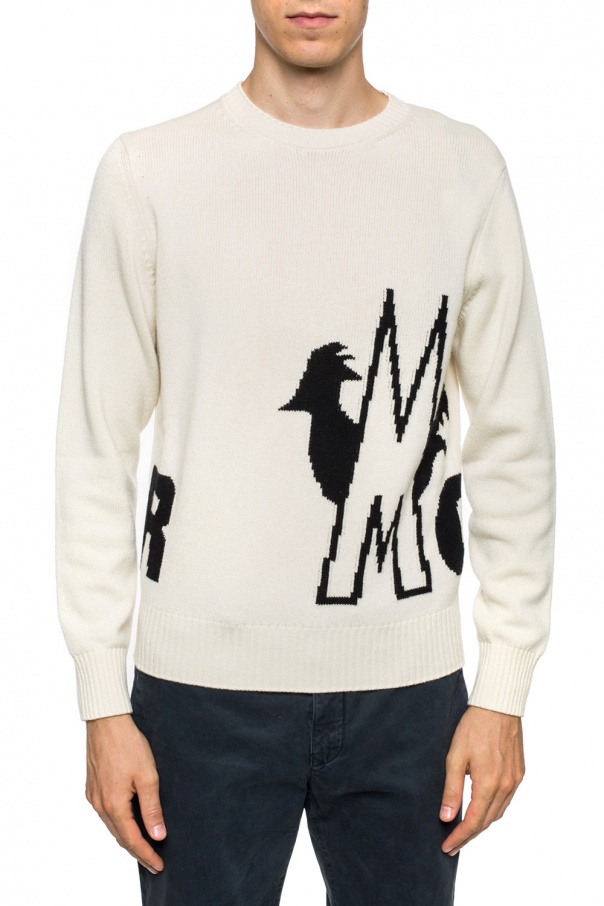 Cream sweater from Moncler. Made of wool. Trimmed with cashmere. Decorated with a black logo embroidery. Round neck. Long sleeves. Elasticized bottom hem and cuffs.