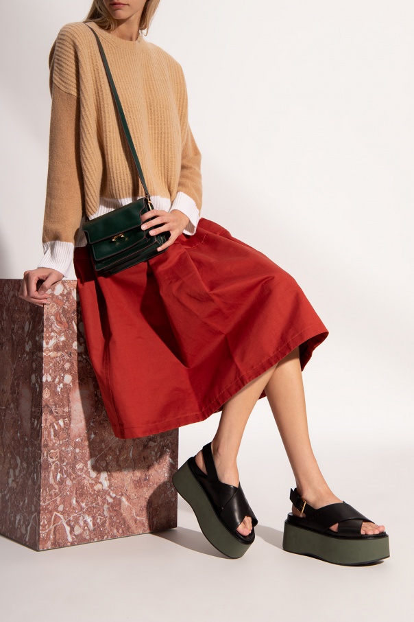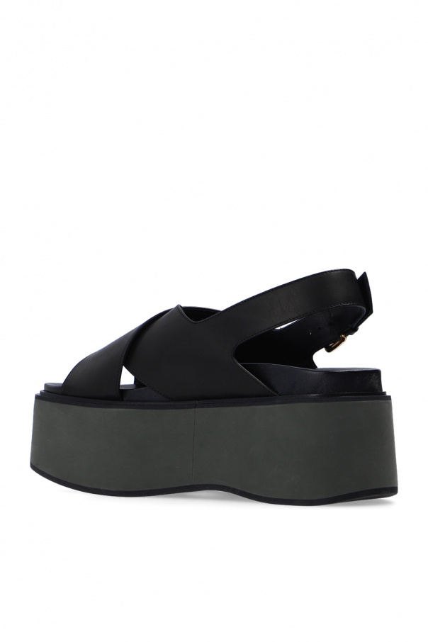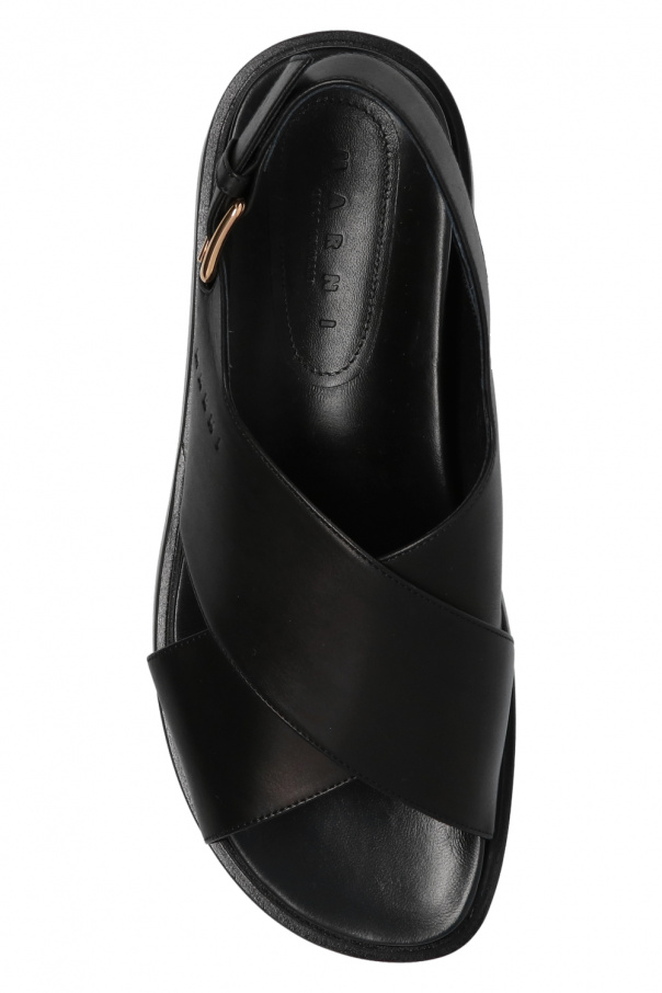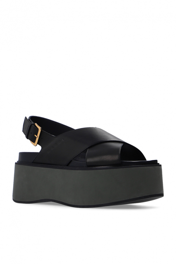 Black and green sandals from Marni. Crafted from leather, they sit on a black and green rubber platform outsole and feature a strap fastening with a gold-tone buckle and an embossed logo for brand recognition.