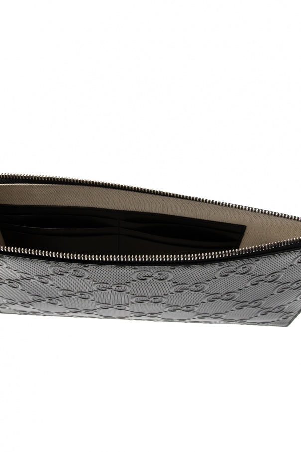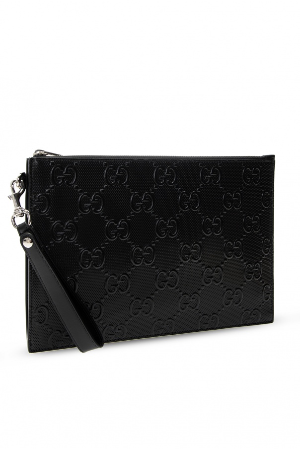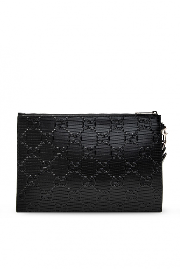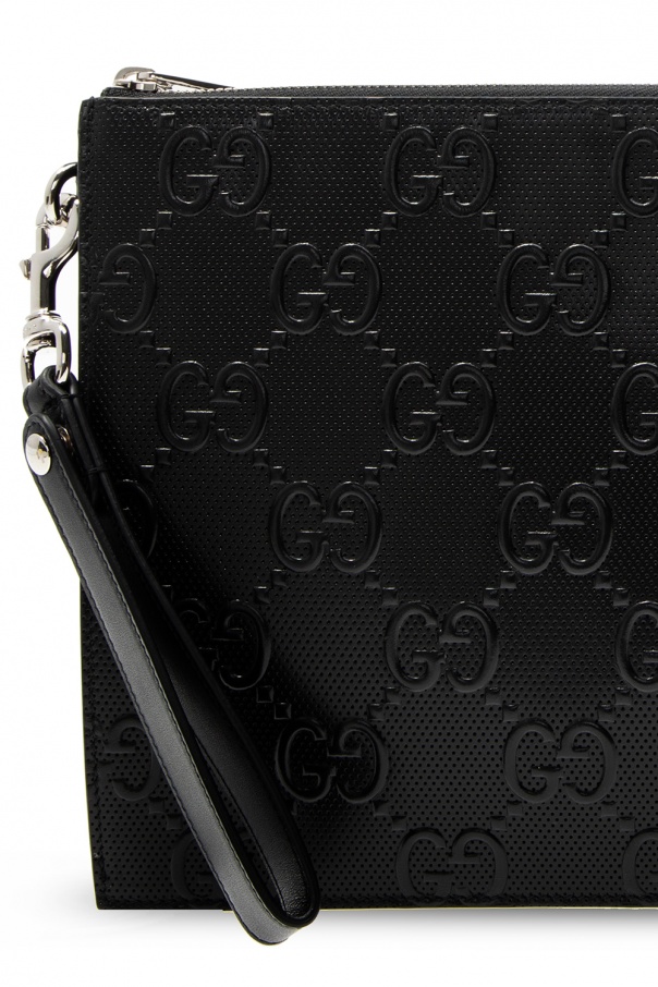 Black clutch from Gucci. Crafted from leather, it fastens with a zip and features an embossed logo pattern, a detachable wrist strap and one internal compartment with one slip pocket and six card slots.