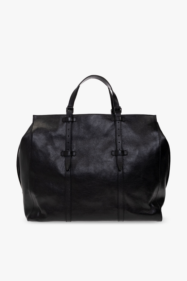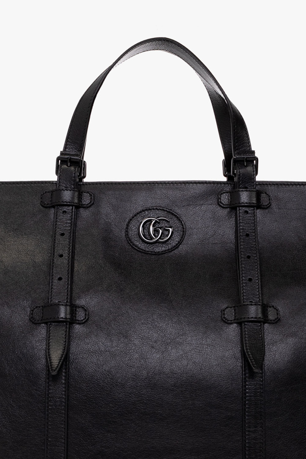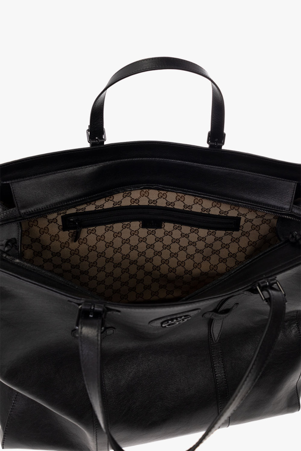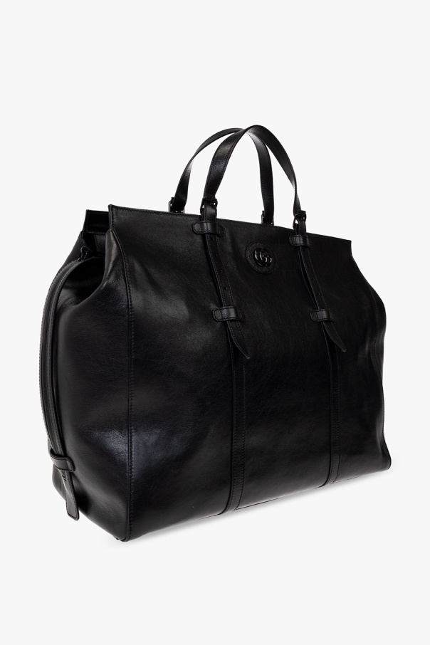 Black duffel bag from Gucci. Crafted from leather, this design fastens with a two-way zipper and showcases a frontal patch with ‘Double G’ hardware, two adjustable handles and one internal compartment with two zip pockets.