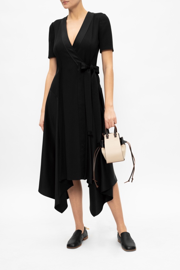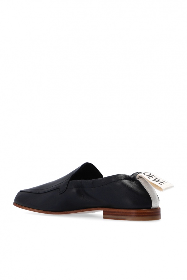 Black moccasins from Loewe. Crafted from leather, this pair boasts a square toe silhouette with an elasticated heel, a white and black branded grosgrain tab at the ankle and a brown leather sole at the base.