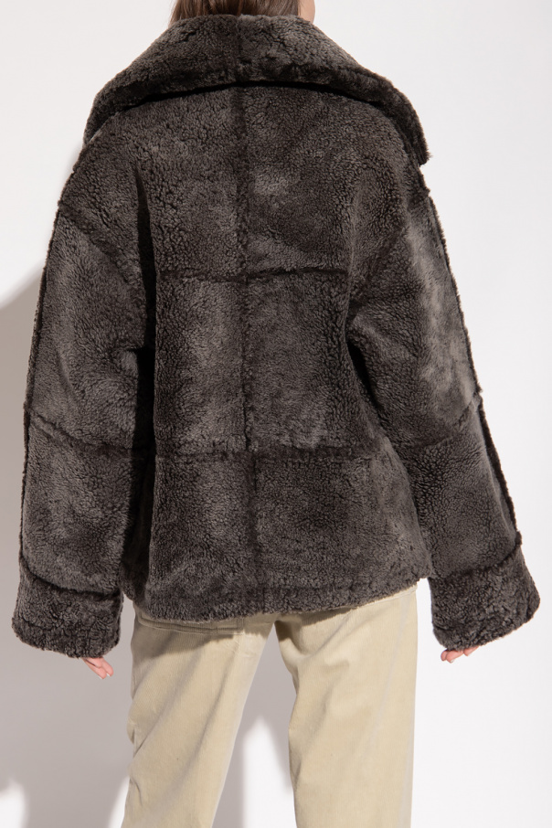 Black and grey loose-fitting shearling jacket from Halfboy. Crafted from sheep leather, this garment features a zip fastening, wide collar, two front pockets and long sleeves.