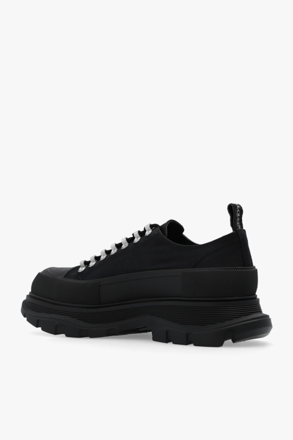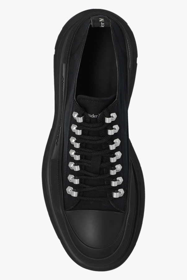 Black platform shoes from Alexander McQueen. Resting on a black rubber sole, this lace-up pair is decorated with a raised logo on the side.