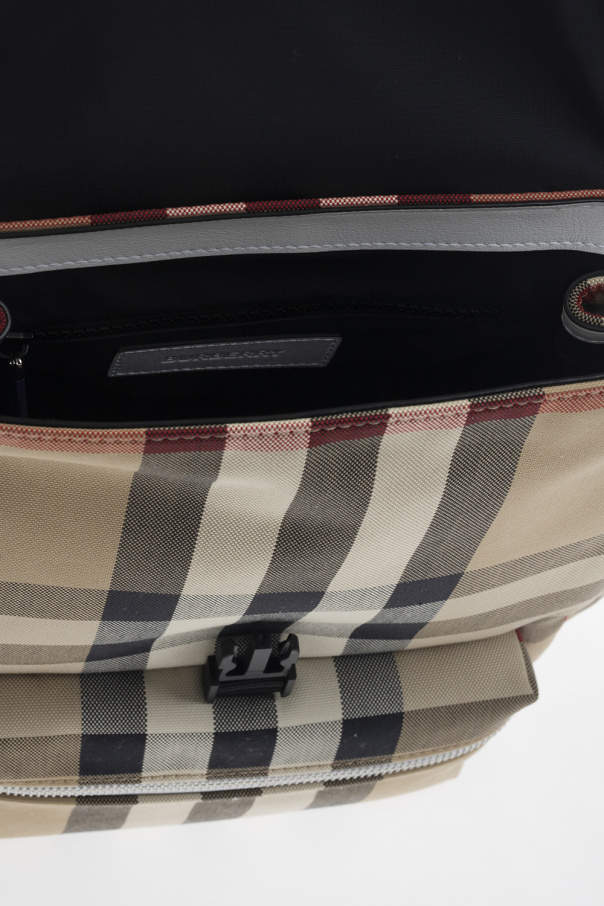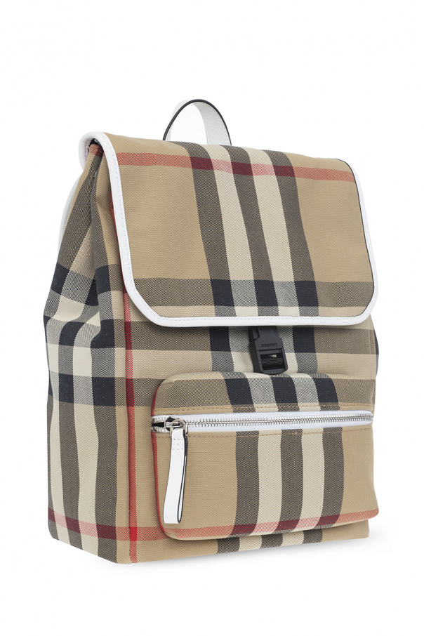Beige ‘Dewey’ backpack from Burberry Kids. Enriched by the ‘Vintage’ check pattern, this design features a black fastener with a logo, a zipped pocket on the front, a quilted back with a card holder, adjustable shoulder straps, white leather trims and one internal compartment with two slip pockets and one zipped pocket.