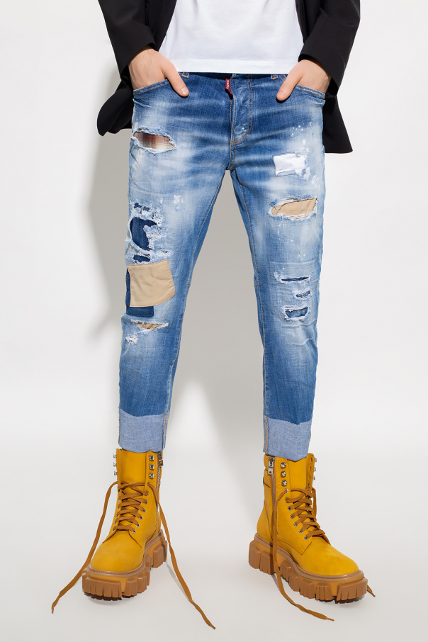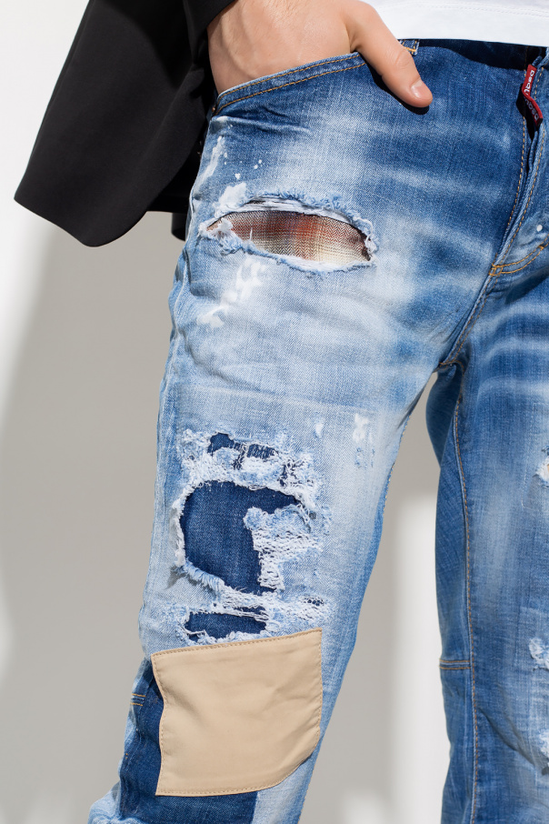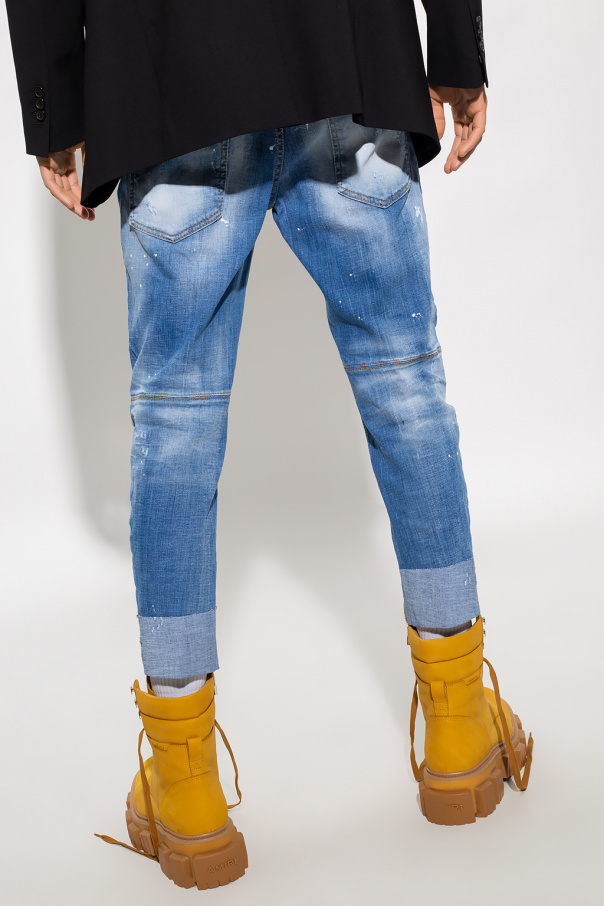 Blue and white ‘Sailor’ jeans from Dsquared2. Made of cotton, this pair showcases a distressed treatment, paint splatters, checked inserts, button fastenings, classic five pockets, turn-up hems and a red logo patch at the back.
