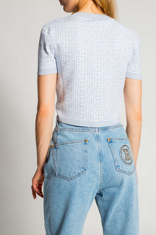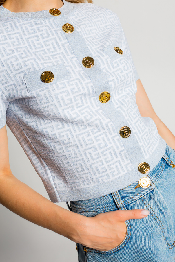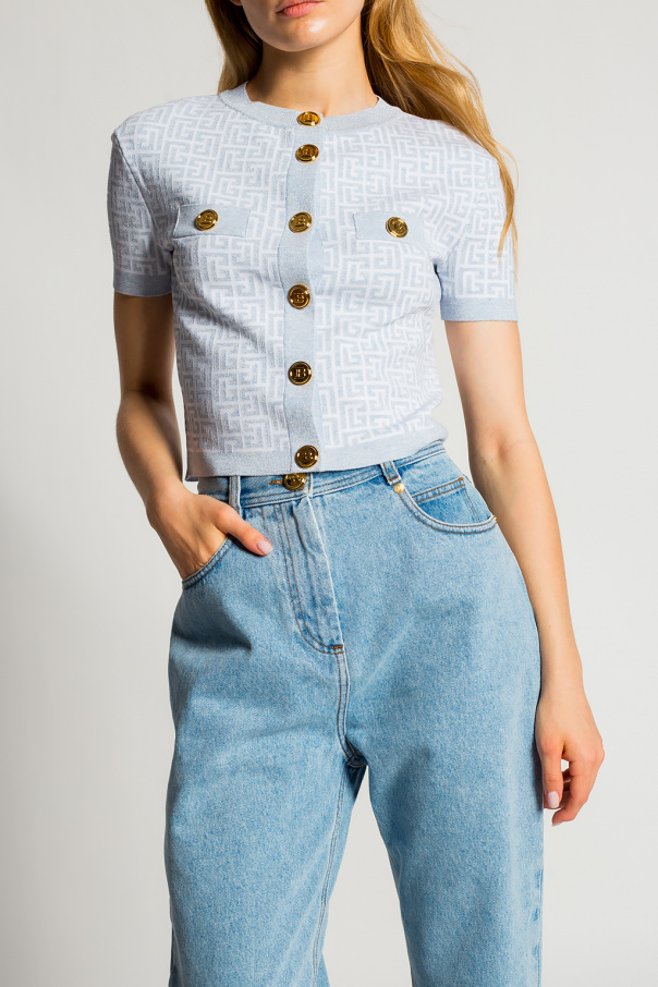Light blue and white cardigan from Balmain. Fastened with decorative gold-tone snaps with a logo, this garment features an embroidered pattern, a silver-tone lurex thread, round neck, short sleeves and ribbed trims.