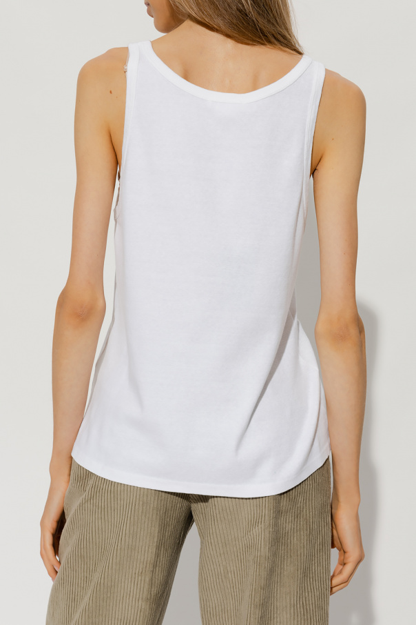 White tank top from A.P.C. x Jane Birkin. Made of natural cotton yarn from sustainable farms, this style features a round neck and red logo embroidery on the front.