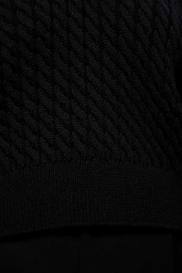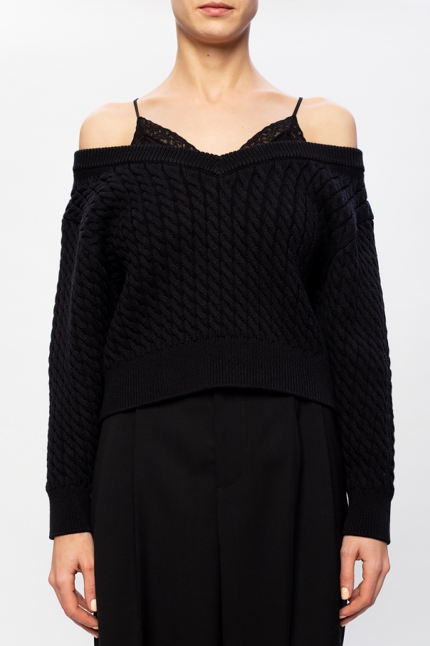 Black sweater from T by Alexander Wang. Knitted from ribbed fabric, this long-sleeved jumper showcases V-neckline, lace accents and adjustable shoulder straps.