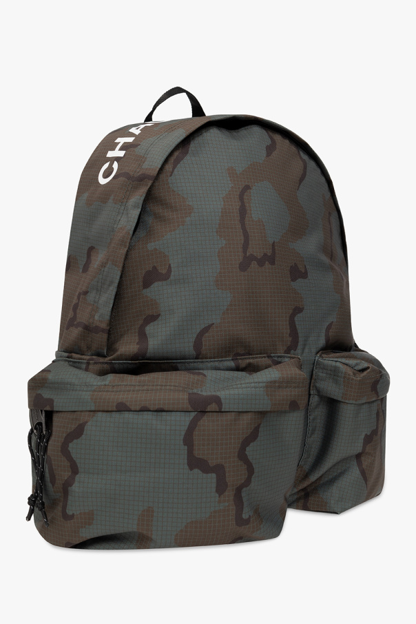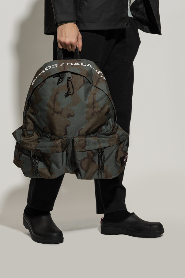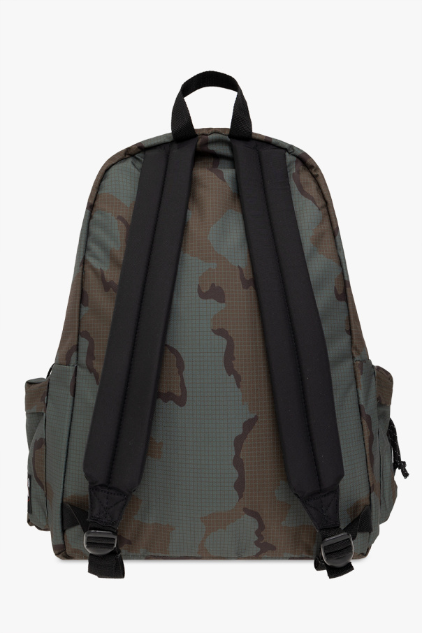 Green and brown backpack from Undercover x Eastpak. Crafted from recycled materials and embellished with a camo motif, this design secures with a two-way zipper and features a white graphic print, two zip pockets on the front, a half-round handle, adjustable shoulder straps, black metal hardware and one internal compartment with one zip pocket and one slip pocket.