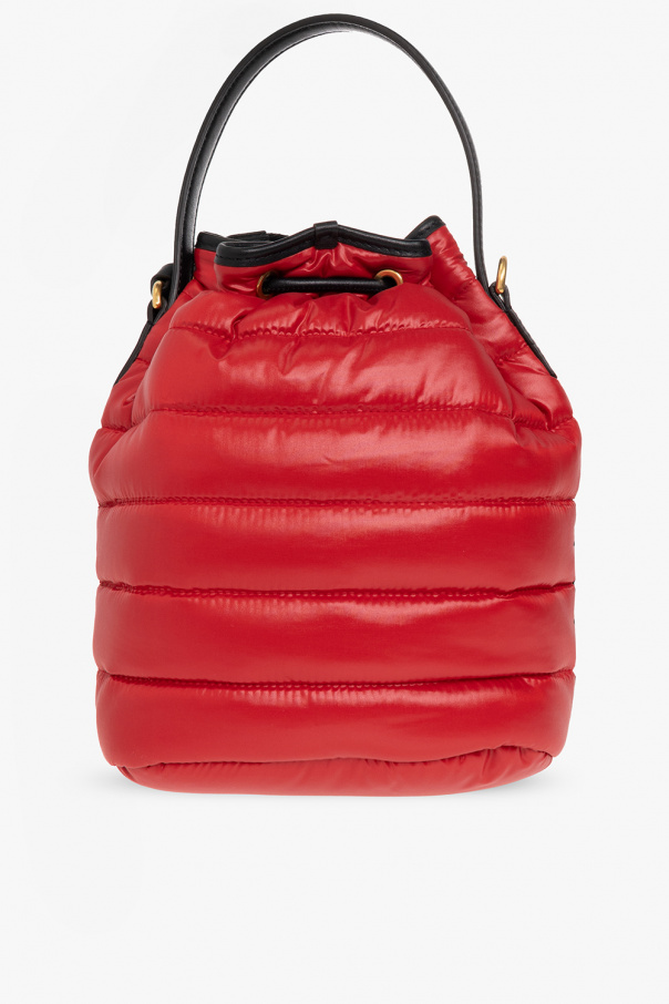 Red ‘Kilia’ quilted bucket bag from Moncler. Crafted from shiny fabric with leather trims, this design fastens with drawstrings and is complete with a front zip pocket, leather logo patch, half-round handle, detachable shoulder strap with a logo embroidery, gold-tone metal hardware and one internal compartment with one slip pocket.