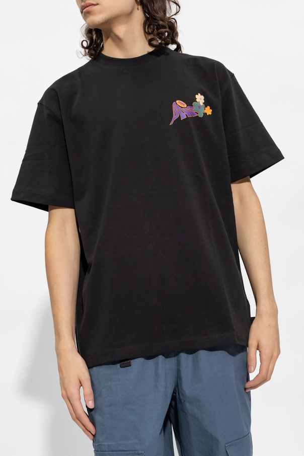 Black T-shirt with a vintage effect from Puma x PAM. Made of partially recycled cotton, this short sleeve design features a multicolored printed logo pattern and ribbed crew neck.