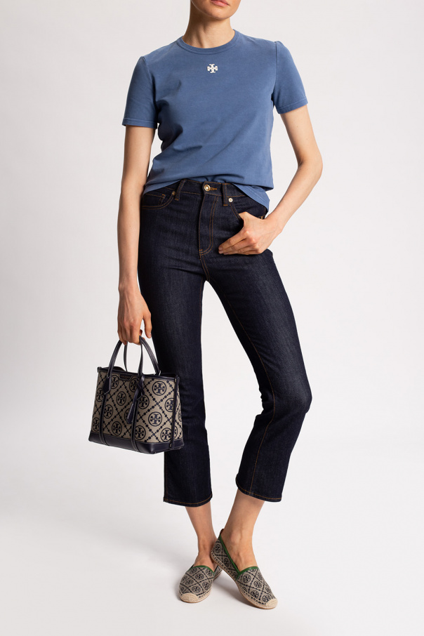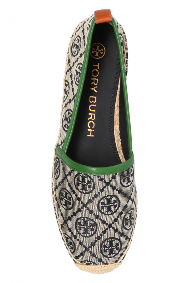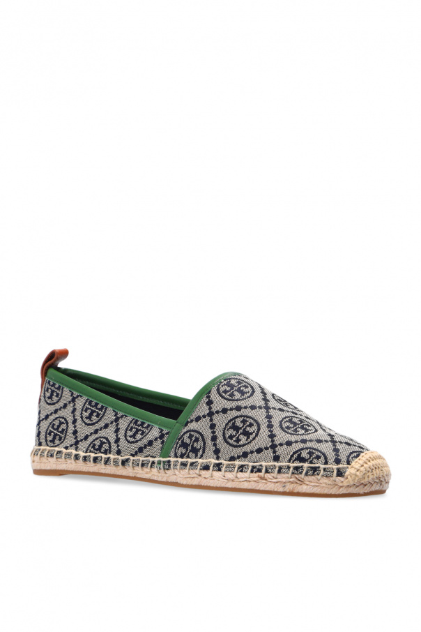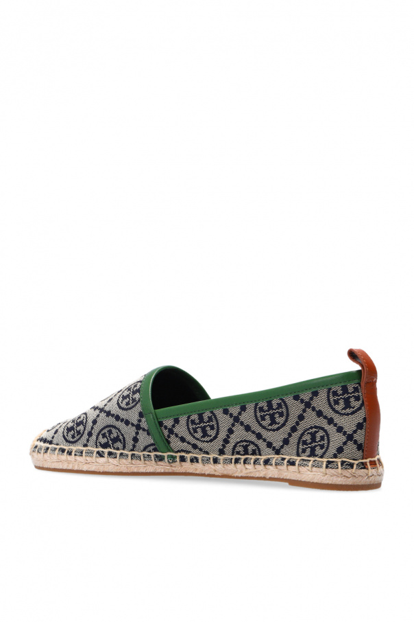 Multicolored ‘T Monogram’ espadrilles from Tory Burch. Crafted from canvas with leather trims, this pair features an embroidered logo pattern, gold-tone logo detail and a brown rubber sole.
