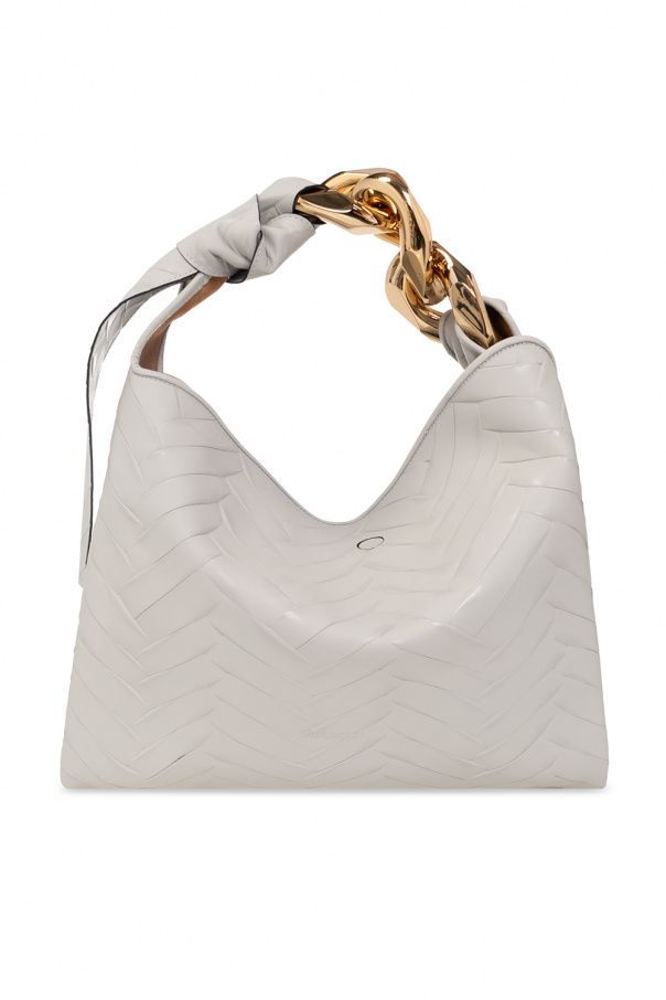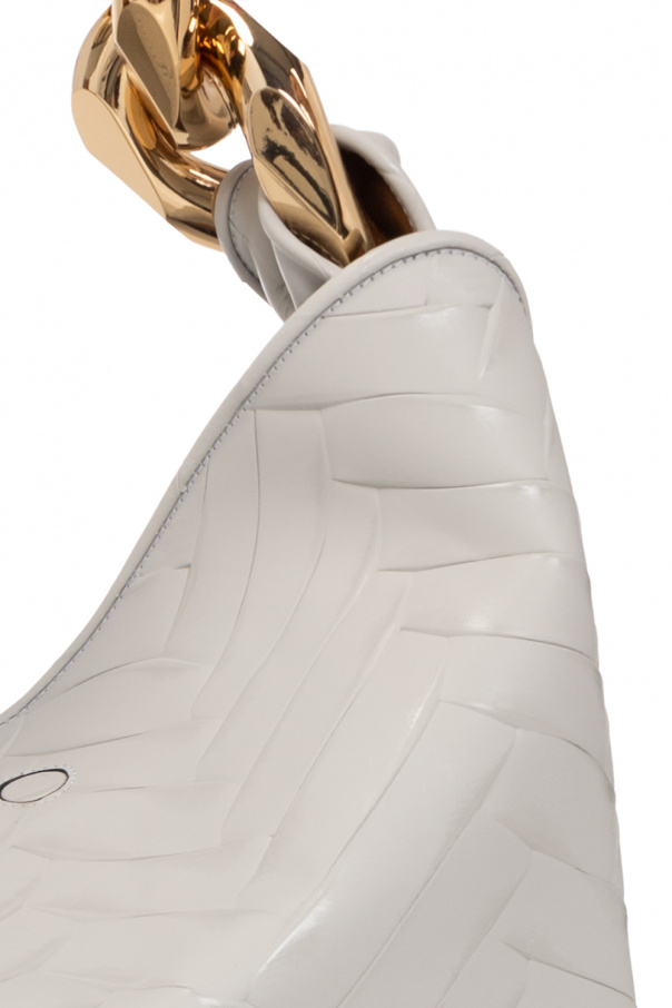Grey ‘Chain Small’ hobo bag from J.W. Anderson. Fastened with a magnetic snap, this model features a decorative raised pattern, embossed logo, half-round handle with metal chain links and a knot as well as gold-tone metal hardware.