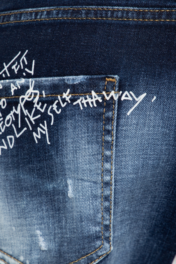 Blue and white ‘Cool Girl Cropped’ jeans from Dsquared2. Falling with tapered, cropped legs, this pair features a stonewashed and bleached treatment, button fastenings, a red and white logo tag on the front, classic five pockets, white paint splatters, black stitch detailing and a branded calf leather patch with ‘Ciao Bella’ inscription at the back.