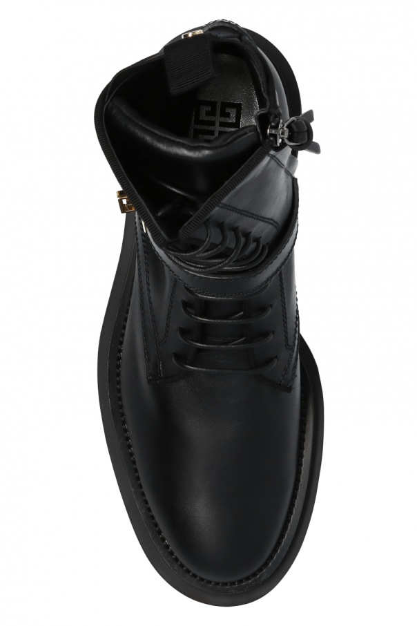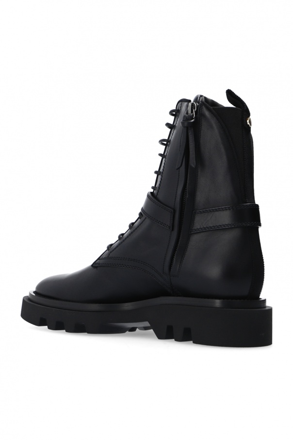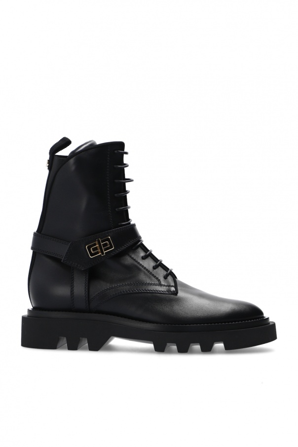 Black ‘Eden’ ranger boots from Givenchy. Crafted from leather, this lace-up pair sits on a black rubber sole and showcases side zip closure, almond-shaped toe and a distinctive strap with gold-tone twist clasp around the ankle.