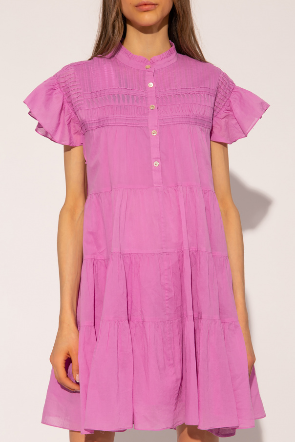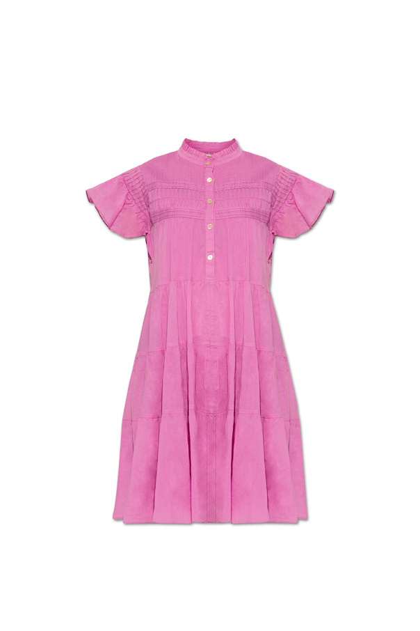 Pink ‘Lanikaye’ dress from Isabel Marant Étoile. Made of cotton, this style features button fastenings on the front, gathers and ruffle detailing on the standing collar, short sleeves and bottom hem. It comes with a slip.