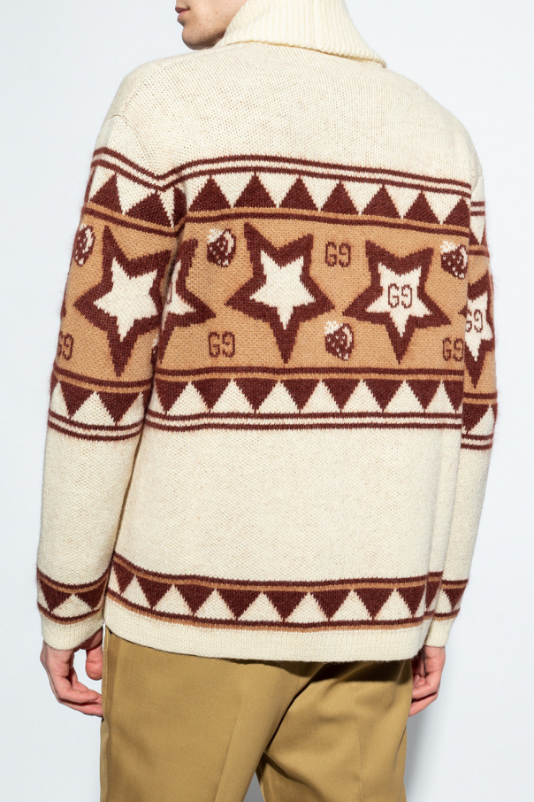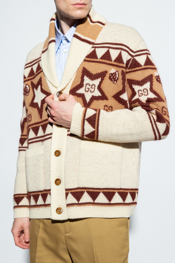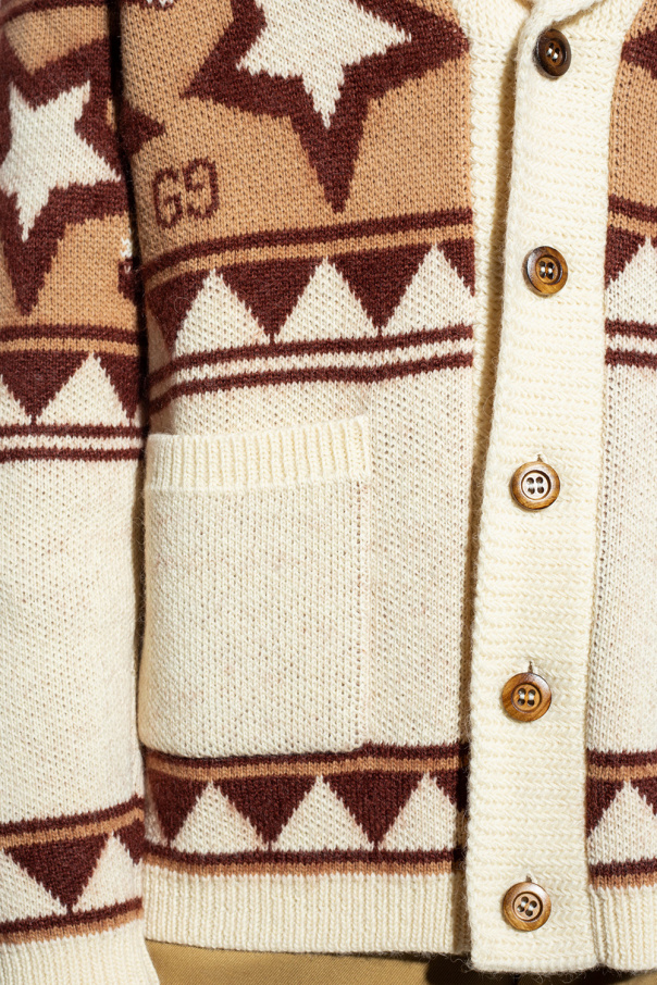Brown, beige and cream cardigan from Gucci. Crafted from a wool, silk and mohair blend, this style showcases a graphic pattern, logo detailing, button fastenings, two slip pockets and an elasticated bottom hem and cuffs.