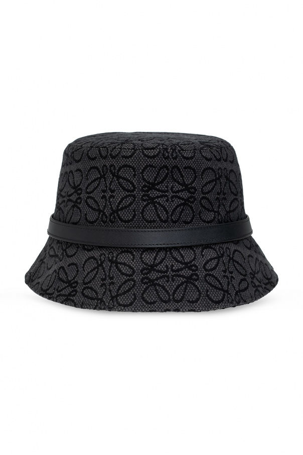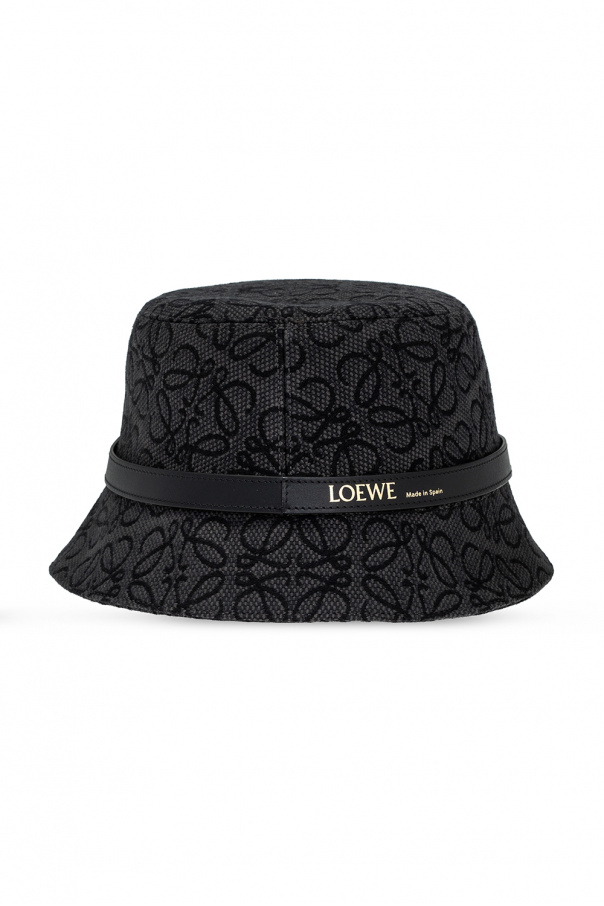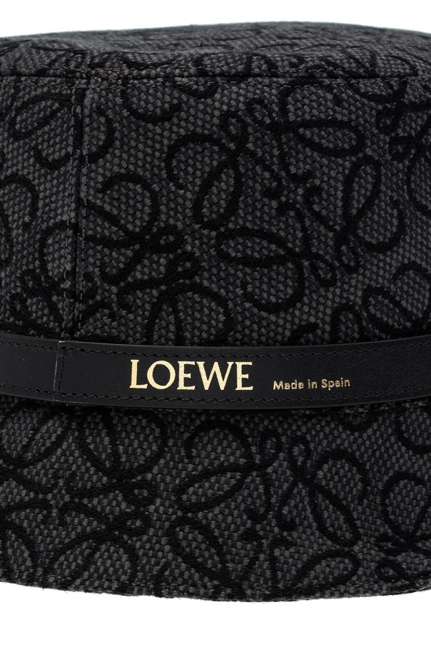 Dark grey hat from Loewe. Crafted from cotton, this item showcases a jacquard logo pattern, a black calf leather band and a gold-tone graphic print.