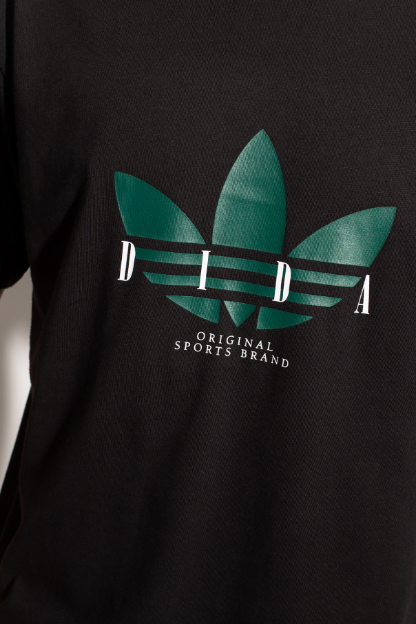 Black crewneck T-shirt from ADIDAS Originals, the ‘Better Cotton Initiative’ line. Made of cotton from sustainable farms, this style features a white and dark green graphic print with the brand's logo.