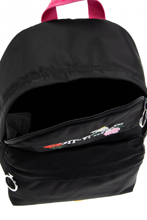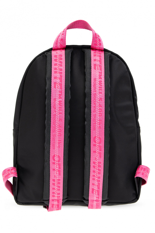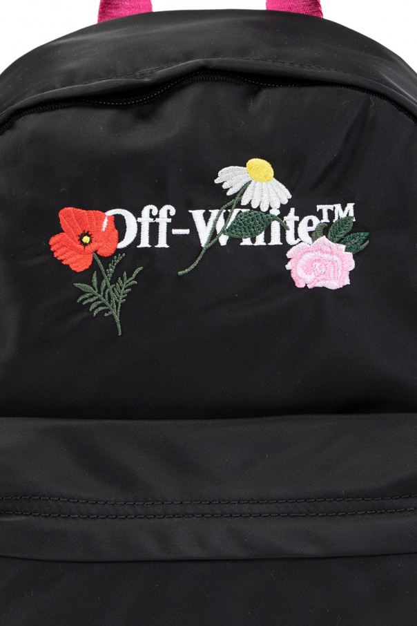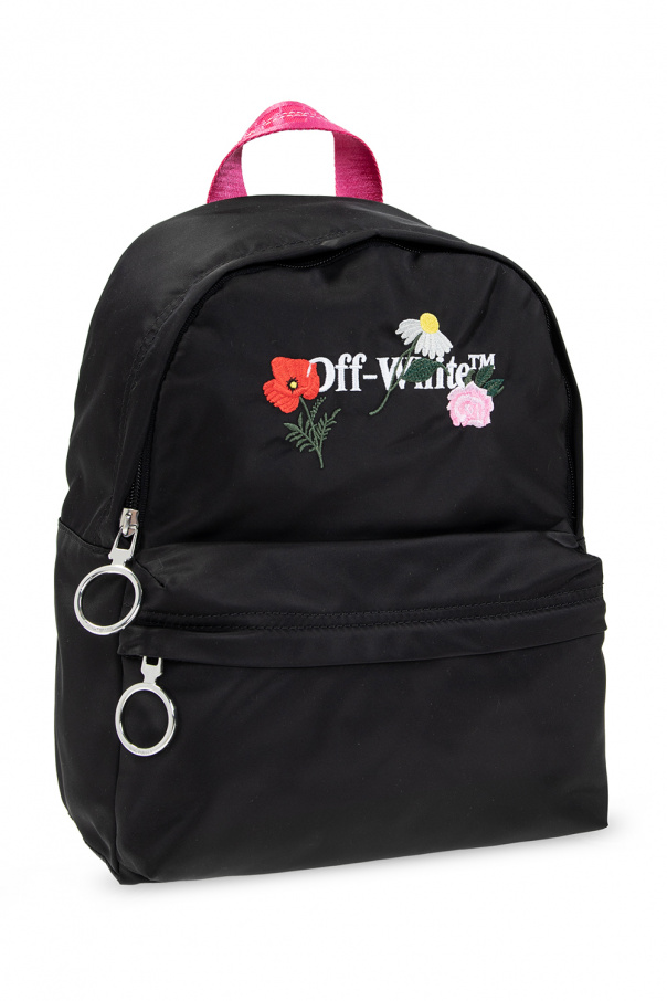 Black backpack from Off-White Kids. Embellished with an embroidered colourful logo motif, this design fastens via a zip and features a zip pocket on the front, a half-round top handle, adjustable shoulder straps, silver-tone metal hardware and one internal compartment.