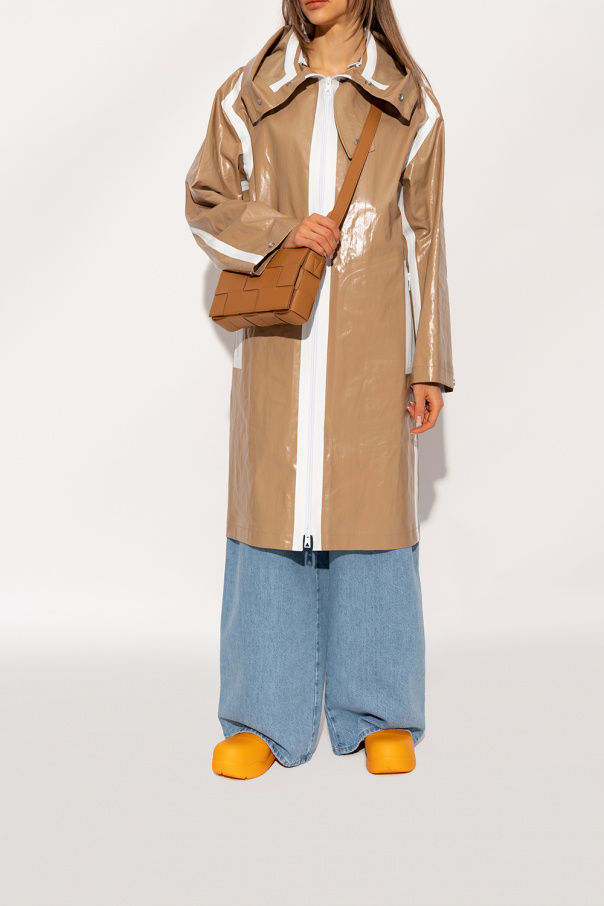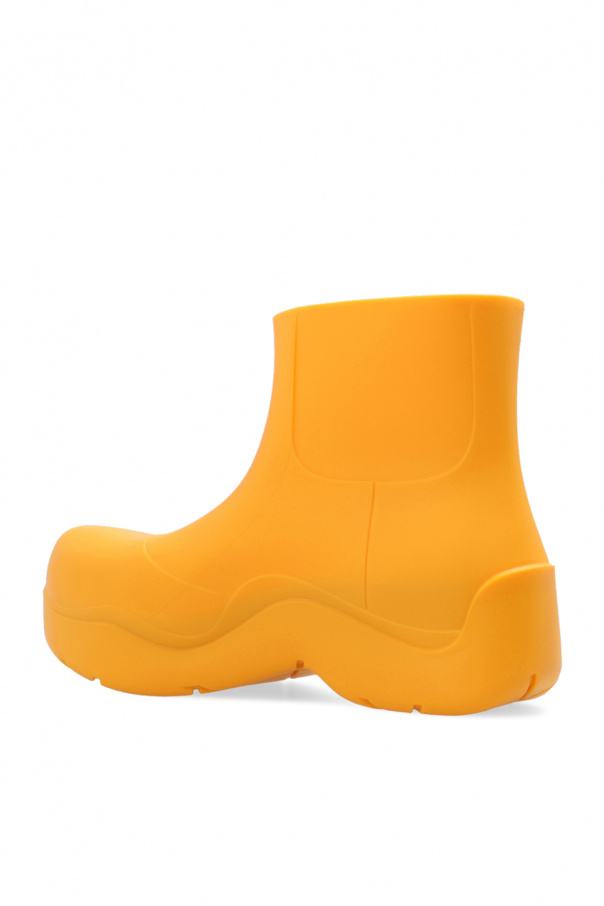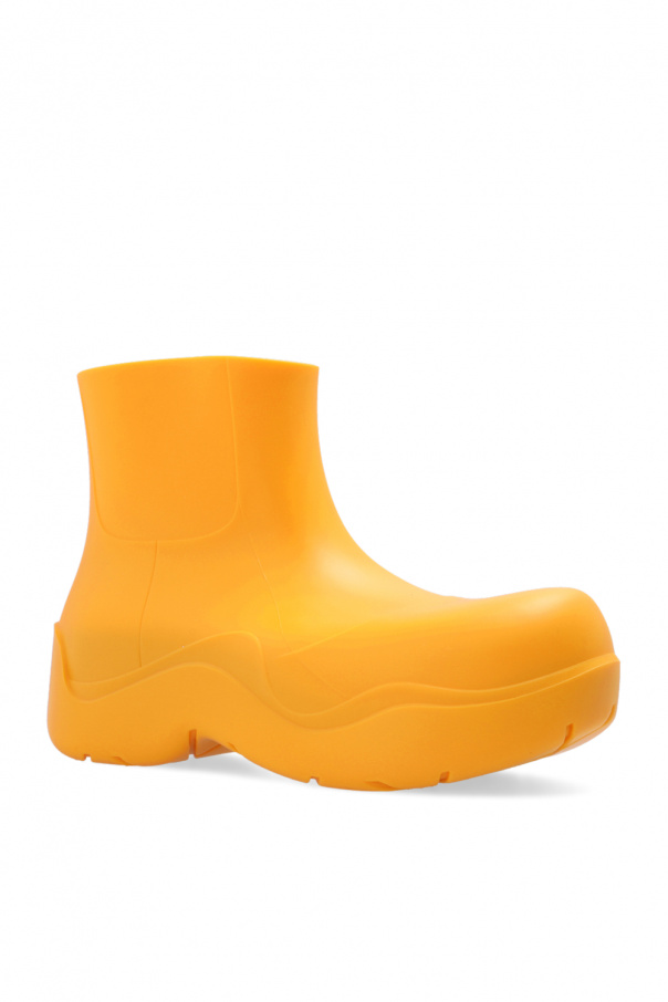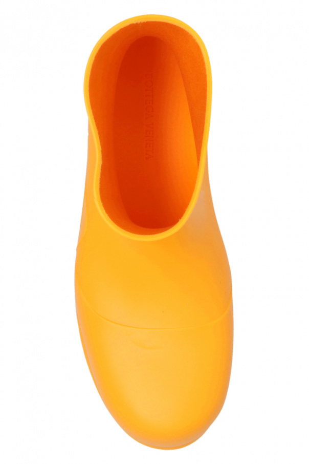Orange ‘Puddle’ short rain boots from Bottega Veneta. Crafted from biodegradable rubber, this one-piece moulded model features a seamless construction, cotton lining and a yellow rubber sole.