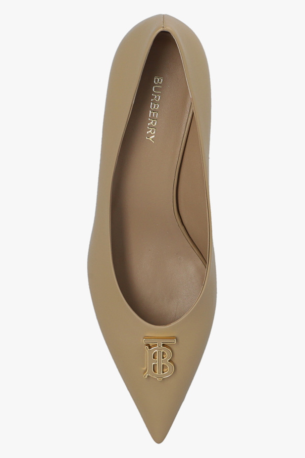 Beige ‘Ezra’ pumps from Burberry. Made of leather, this pair features a metal logo detail, pointed toe and cream leather sole.