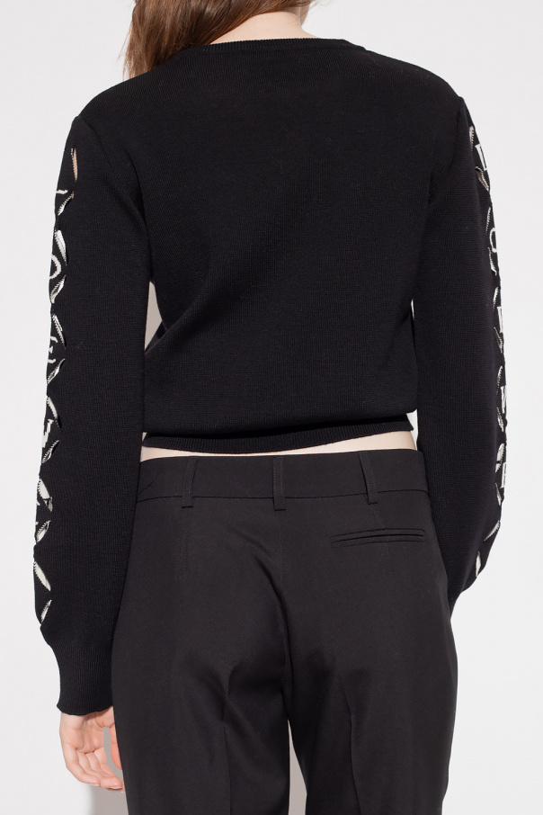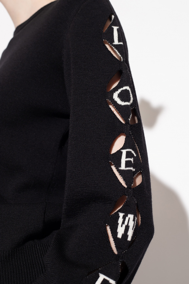Black sweater from Loewe. Crated from wool, this garment is enriched by cut-outs, logo pattern and ribbed trims at the crew neck, hem and cuffs.