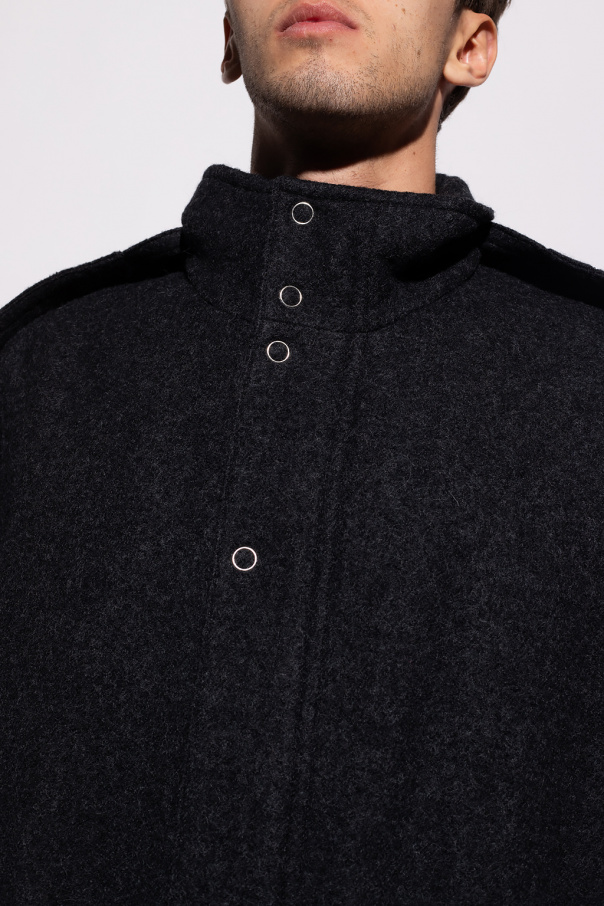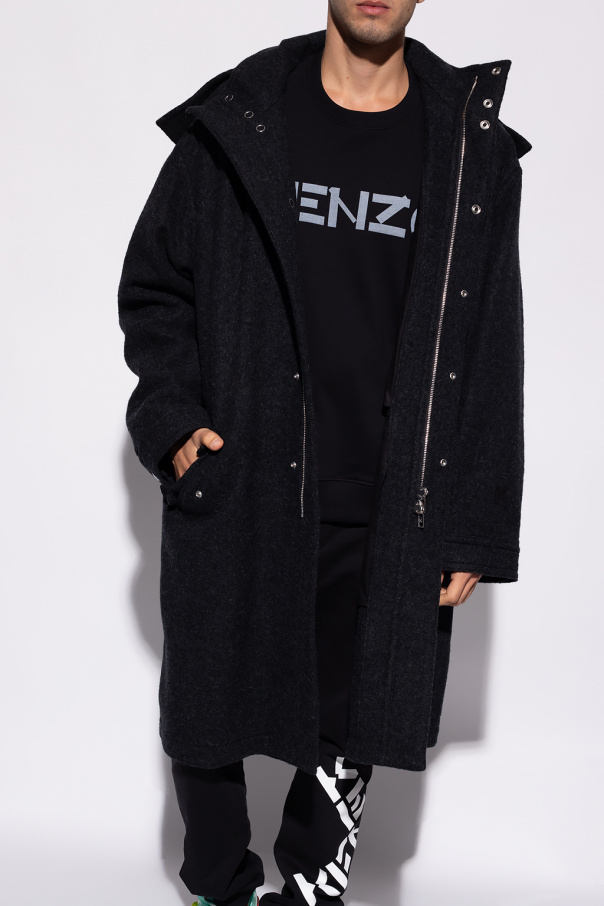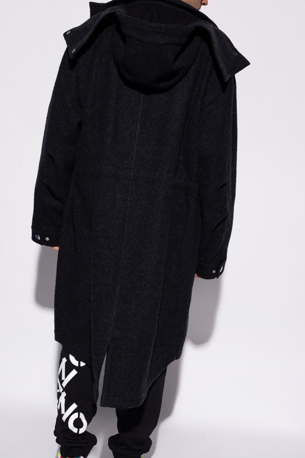 Dark grey coat with a detachable hood from Kenzo. Crafted from wool, this style fastens via snaps, buttons and a two-way zipper and features two snap-fastened flap pockets, long sleeves and a single back vent.