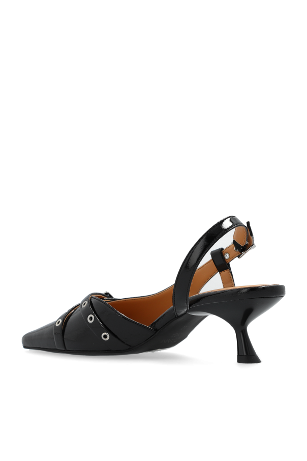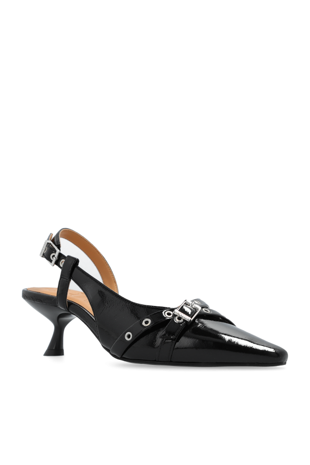 Introducing the quintessence of modern elegance and avant-garde design, the Ganni High-Gloss Leather Heels. Crafted with meticulous attention to detail, these black heels are a testament to the sophisticated aesthetic and innovative spirit of the Ganni brand. The shoes boast a medium-height, slender heel that gracefully flares at the base, ensuring both stability and a touch of allure. This feature, combined with the pointed front, elongates the leg, offering an illusion of height and slenderness. The incorporation of adjustable ankle straps ensures a bespoke fit, enhancing comfort and securing the shoe elegantly in place. Moreover, the high-gloss leather finish speaks volumes about the quality of the materials used, promising durability and a lasting sheen. The punk-inspired metallic studs and buckles add an edgy contrast to the otherwise sleek silhouette, making these heels versatile enough to complement both casual and formal ensembles. Each pair is adorned with the designer's logo on the leather insole, signifying authenticity and luxury. With their rubber outer layer, inner lining, and sole, these heels guarantee comfort, making them suitable for extended wear. Why Invest in These Heels? Elegant design with a medium-height, flared heel for enhanced stability. Adjustable ankle strap for a custom fit and supreme comfort. High-gloss leather finish and metallic accents for a luxurious, edgy look. Versatile styling potential, from punk-inspired to sophisticated chic. Emblematic designer logo on the insole, showcasing brand prestige.