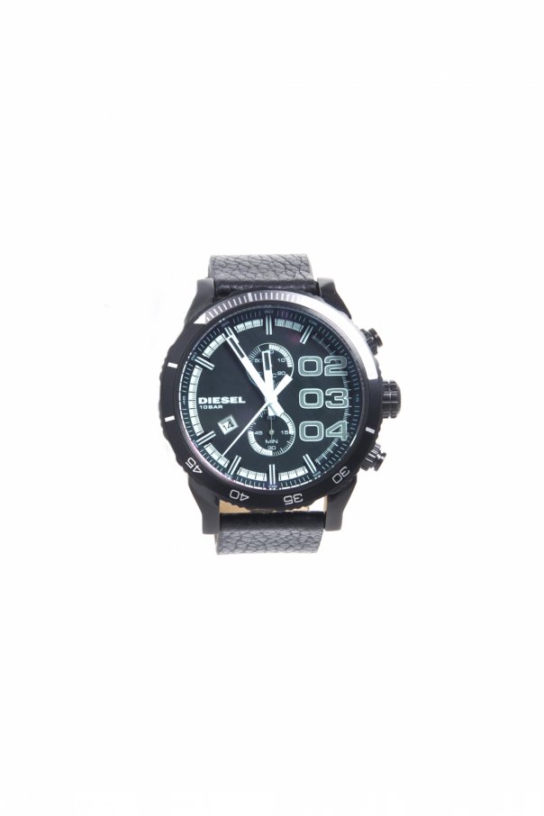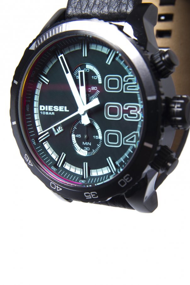 Black stainless anti allergic steel quartz watch from Diesel. Black grainy leather strap. 100 meters water-resistant. Big black chronograph dial with fluorescent elements and coloured glass.