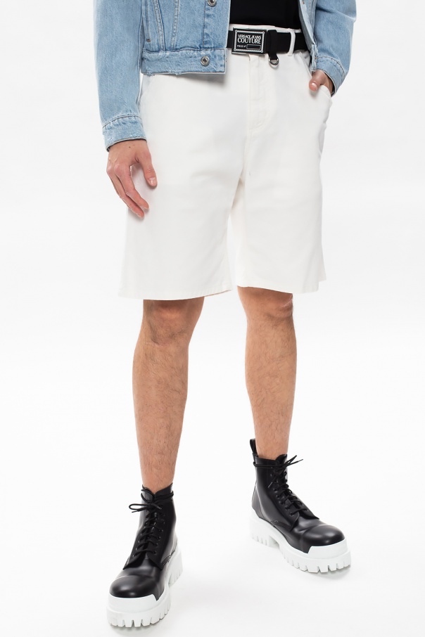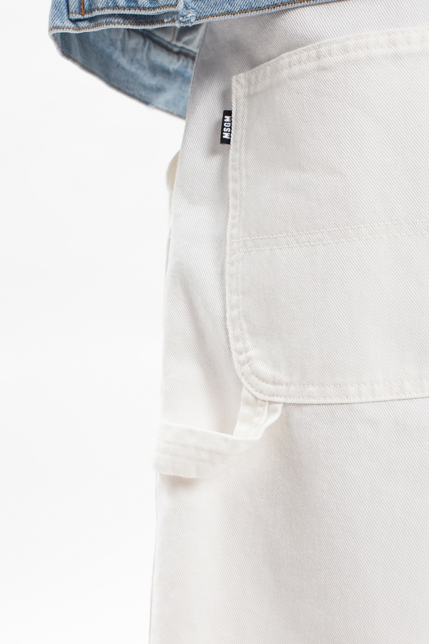 White denim shorts from MSGM. Fastened with a zip and buttons, this design features four slip pockets and an embroidered logo pattern.