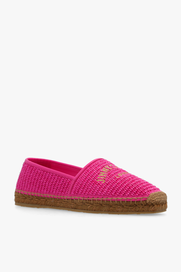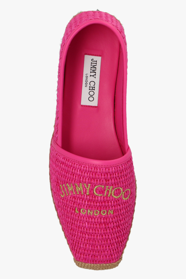 Dark pink ‘Brie’ espadrilles from Jimmy Choo. Crafted from woven raffia and trimmed with leather, this model sits on a beige jute sole with a rubber trim and features an embroidered gold-tone logo on the front.