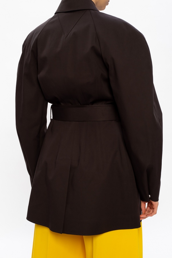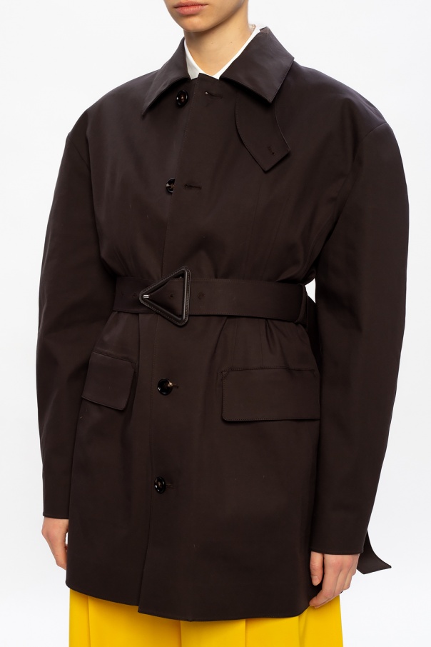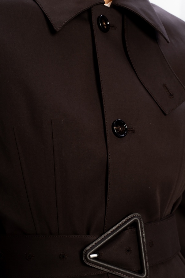 Dark brown coat from Bottega Veneta. Cut from cotton with a fitted silhouette cinched at the waist, this style fastens via buttons and employs two flapped pockets and long sleeves with snap-fastened cuffs.