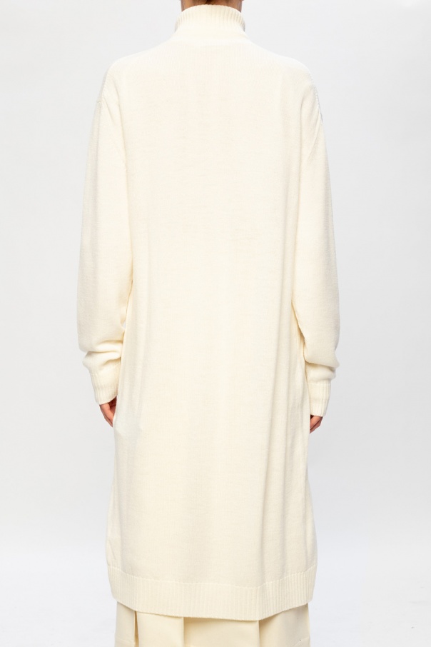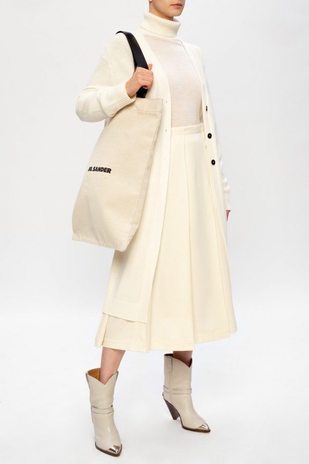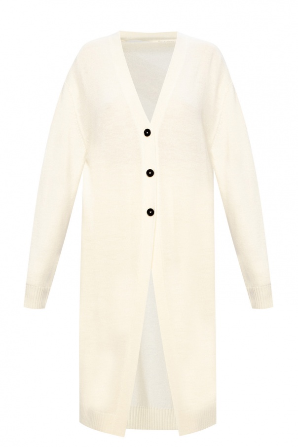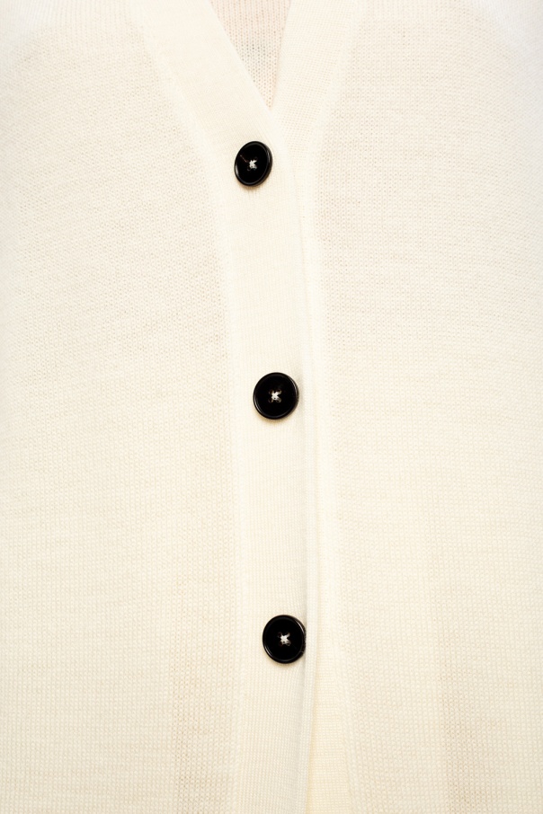 Cream cardigan from Jil Sander. This item is knitted from wool and complete with black buttons and rib trims at the hem and cuffs.