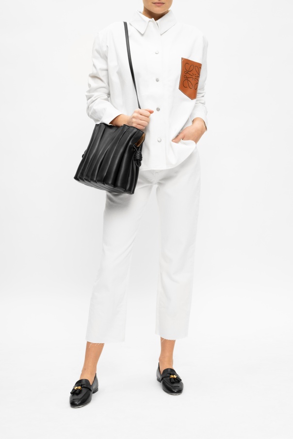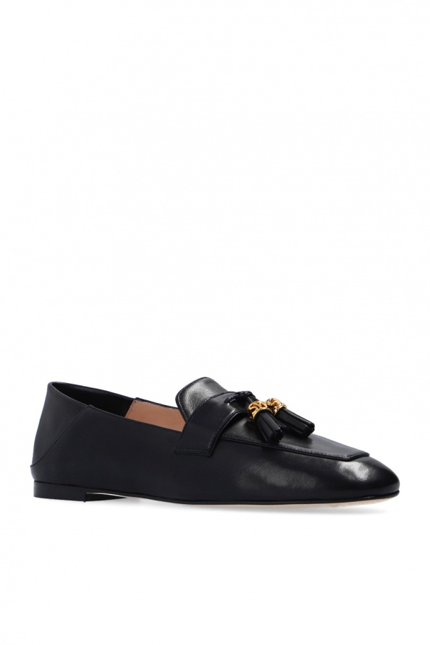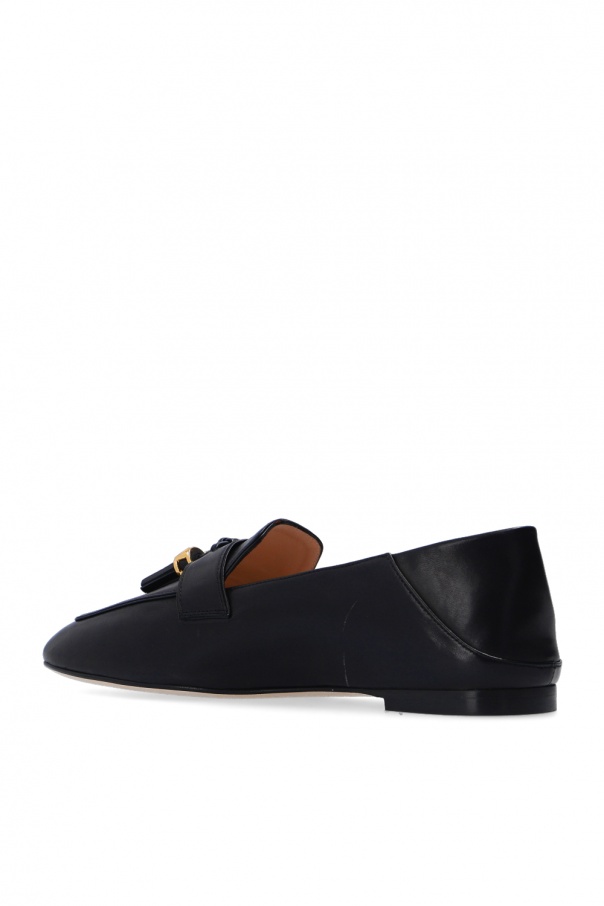 Black ‘Wylie’ leather moccasins from Stuart Weitzman. Resting on a beige leather sole, this pair is enriched by a gold-tone appliqué.