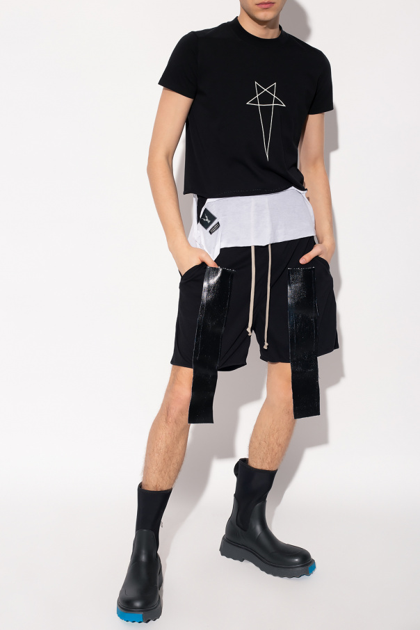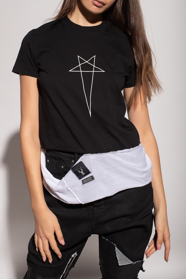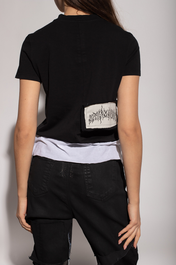 Black crewneck T-shirt from Rick Owens x Swampgod. Made of cotton, this style features short sleeves, an elasticated collar, distinctive raw-cut seams and cut-outs and grey, white and black patches. Item designed to celebrate the 10th anniversary of VITKAC.