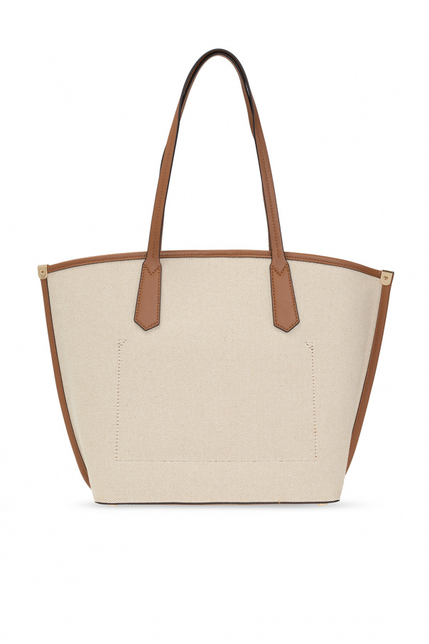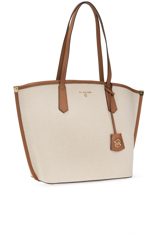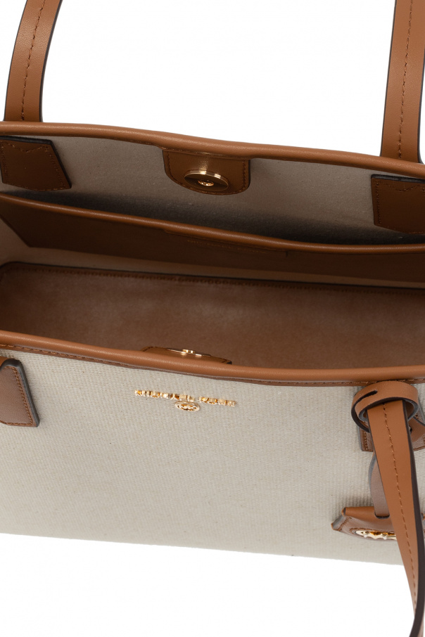 Cream and brown ‘Jane Large’ hand bag from Michael Michael Kors. Made of canvas with leather trims, this design features a snap closure, metal logo, two half-round handles, detachable logo charm, gold-tone metal hardware and one internal compartment with one slip pocket.