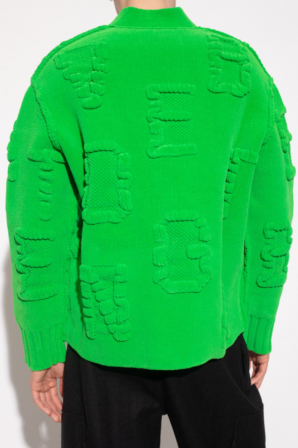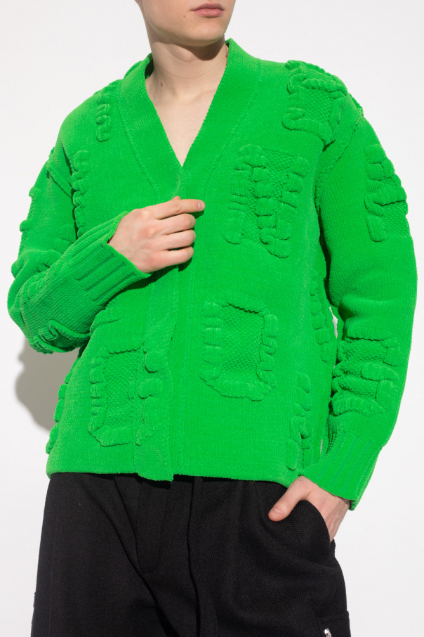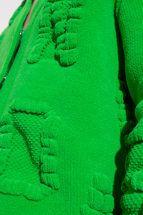 Green cardigan from Bottega Veneta. Crafted from soft chenille, this style features snap fastenings, raised branding and long sleeves with elasticated cuffs.