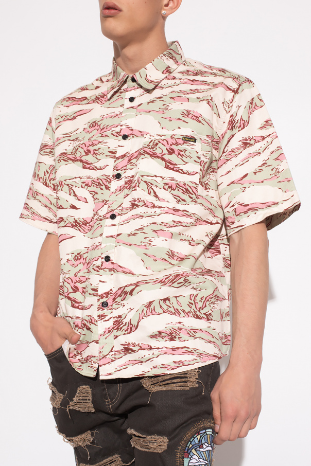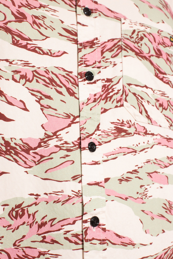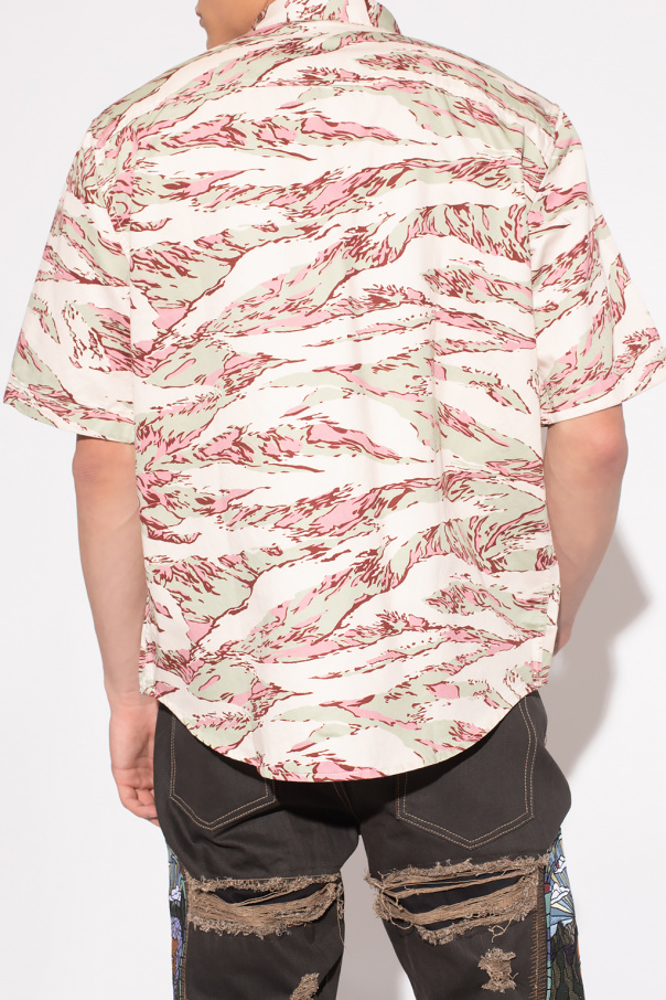 Cream, green and pink ‘S-UMBE’ shirt from Diesel. Crafted from a cotton blend, this garment features button fastenings, camo pattern, front pocket, logo patch and short sleeves.