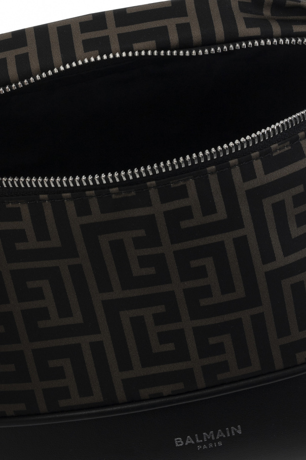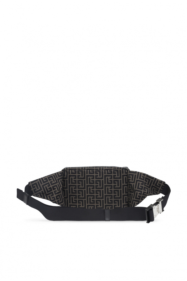 Black and brown belt bag from Balmain. Crafted from fabric enriched by a tonal monogram pattern, this design features a zip fastening, leather trims, a silver-tone logo print on the front, two side zipped pockets, an adjustable strap with a silver-tone buckle with a logo and one internal compartment with a card slot.