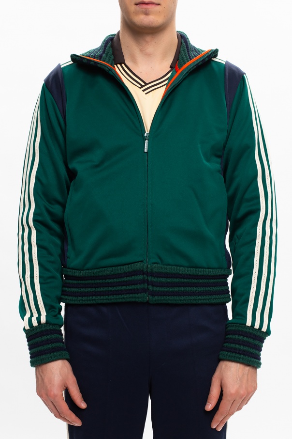 Green track top from ADIDAS Originals x Wales Bonner. Crafted from jersey fabric blend including wool, this long-sleeved piece fastens via zip and showcases two zipped front pockets, elasticated trims and the brand's iconic three stripes in cream running down the sleeves. Capsule collection which pays homage to the British and Caribbean communities that flocked to London's blues clubs in the 1970s.