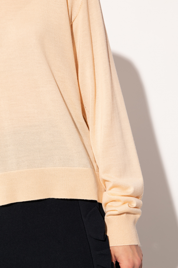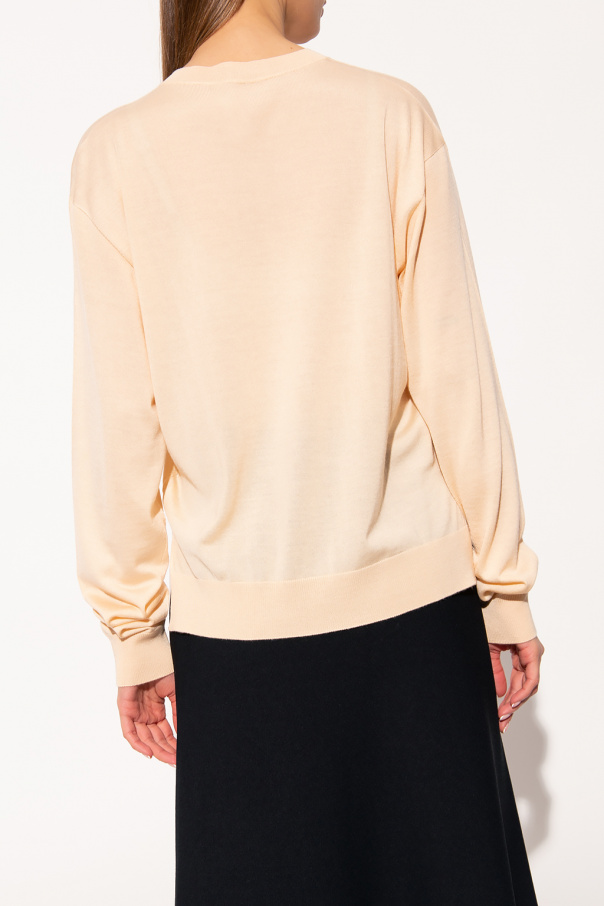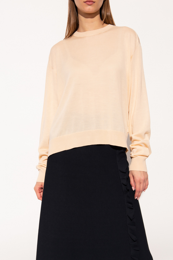 Light orange crewneck sweater from Jil Sander. Crafted from a cashmere, wool and silk blend, this style features long sleeves and side splits.