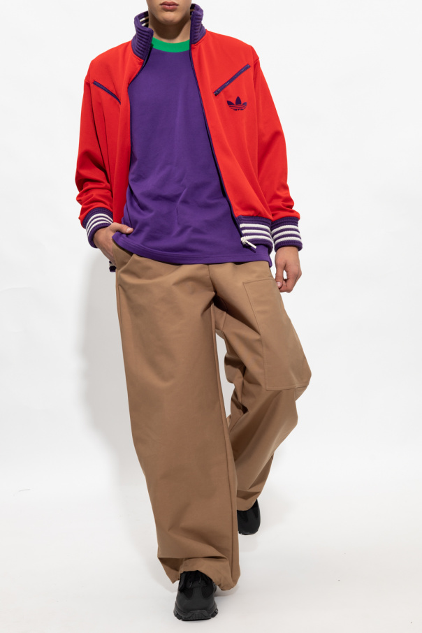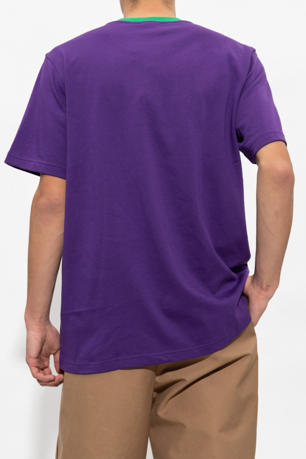 Purple T-shirt from ADIDAS Originals, the ‘End Plastic Waste’ line. Made of a blend of cotton and recycled fabric, this design features a red logo with a velvet finish, ribbed crew neck in green and detachable logo-shaped pin.