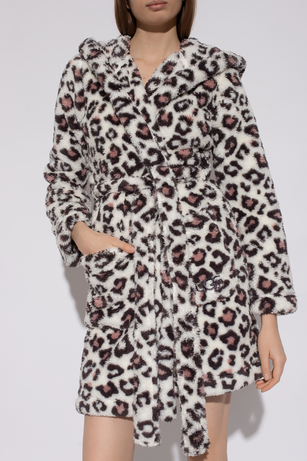 White ‘Aarti’ hooded bathrobe from UGG. Made of faux fur decorated with an animal motif in pink and dark blue, this long sleeve design is complete with a tie belt, two front pockets and a logo embroidery.
