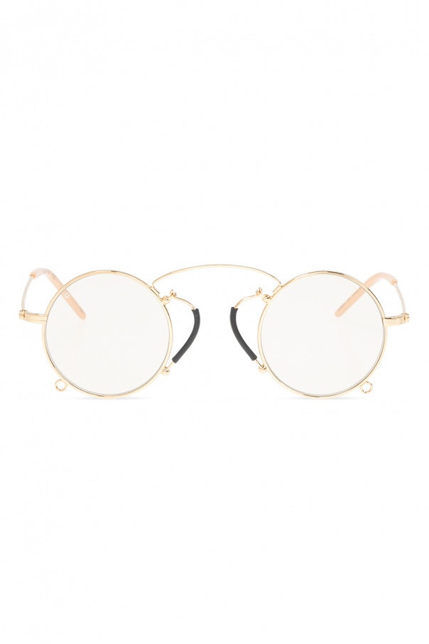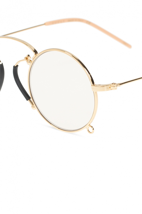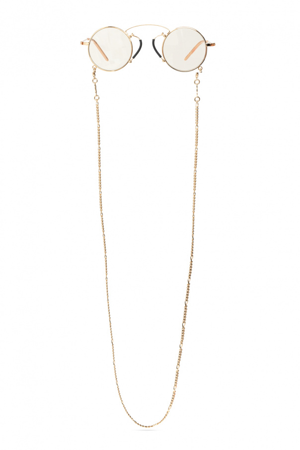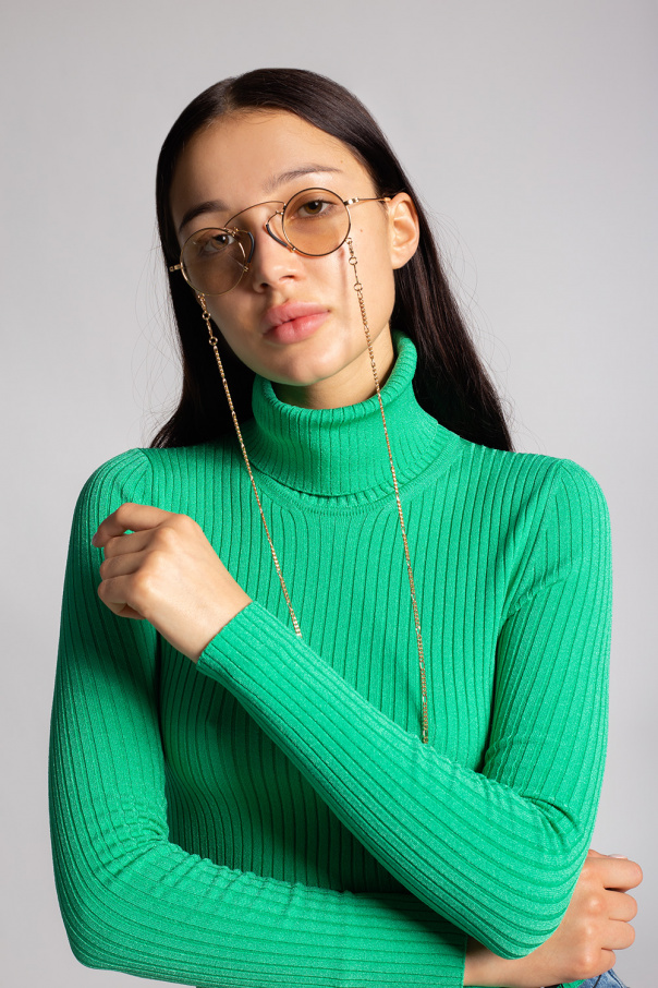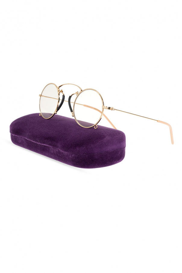 Gold-tone and beige pince-nez style glasses from Gucci. Featuring black details and a logo, this pair comes with a detachable chain and a purple protective case.