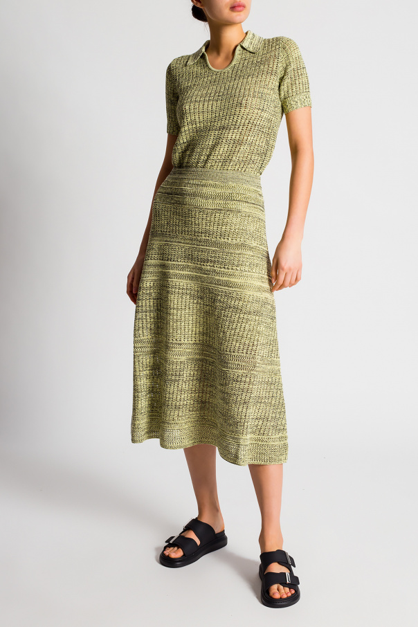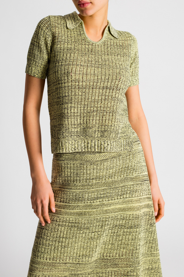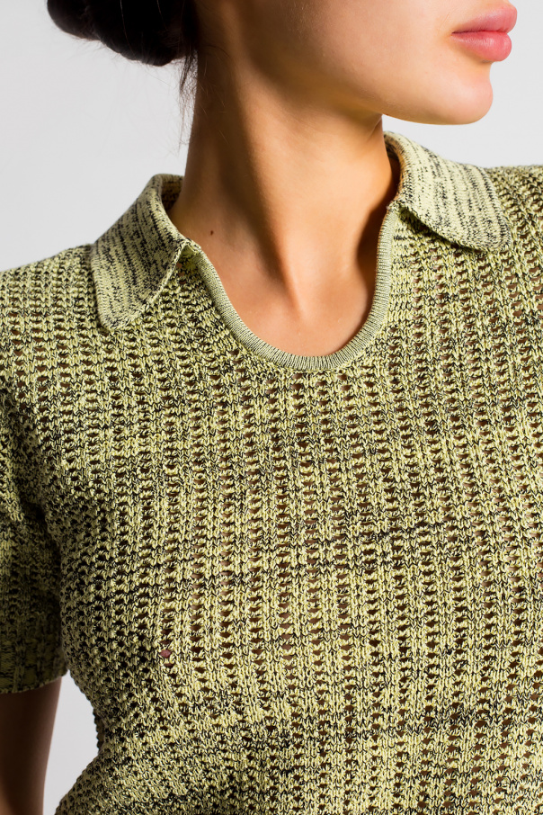 Yellow and black openwork polo shirt from Proenza Schouler, the ‘White Label’ collection. Made of a silk and cotton blend, this round neck design is complete with side slits and short sleeves with ribbed cuffs.