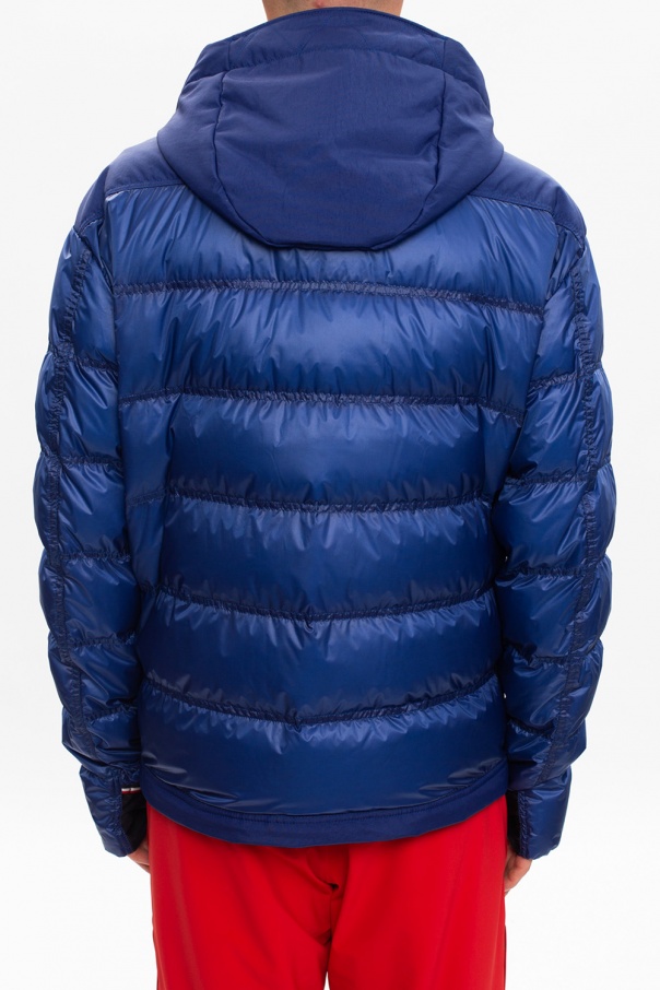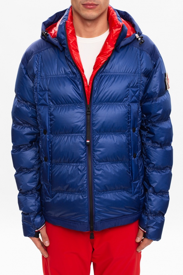 Blue and red ‘Gimillan’ quilted jacket from Moncler Grenoble. Padded with down, this garment features a two-way zip, drawstring hood, cream, red and navy logo patch and two snap pockets on the front.
