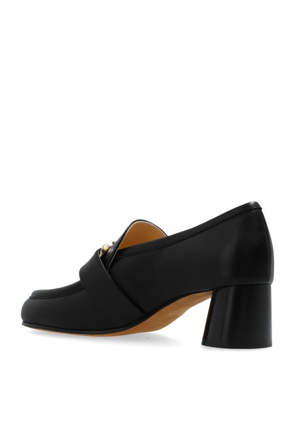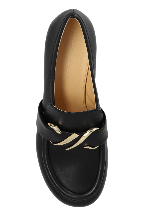 Introducing the "Louise" Heels by Proenza Schouler: a testament to timeless elegance and sophisticated design. Crafted with meticulous attention to detail, these loafers boast a classic silhouette enhanced by the lustrous, black leather that envelops them. The prominent feature, a wide strap adorned with a gold "T"-shaped embellishment, resonates with exclusivity, adding a touch of luxury to this already magnificent piece. The rounded toe and the wide, stable heel not only contribute to the graceful aesthetics but also suggest a level of comfort that is uncommon in heels of such elegance. The interior, lined with high-quality leather, underscores the designer's commitment to luxury that doesn't compromise on comfort. Whether showcased solo, on a model, or paired with an ensemble, the "Louise" heels exude versatility and are a perfect match for both formal and casual attires. Rendered in a classic black, these heels by Proenza Schouler are a quintessential addition to any discerning wardrobe, promising to elevate any outfit with their sophisticated charm and distinguished design. Why Purchase the "Louise" Heels? Elegant, timeless design that complements any wardrobe. Exquisite craftsmanship with high-quality, smooth leather. Comfort-oriented structure with a wide, stable heel. Unique gold "T"-shaped embellishment adds an exclusive touch. Versatile for both formal and casual occasions.