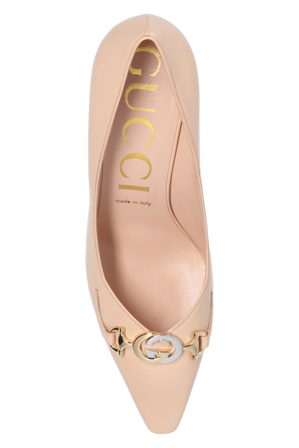 Beige ‘Zumi’ stiletto pumps from Gucci. Crafted from leather, this pair features a silver-tone and gold-tone metal logo detail and a beige leather sole.